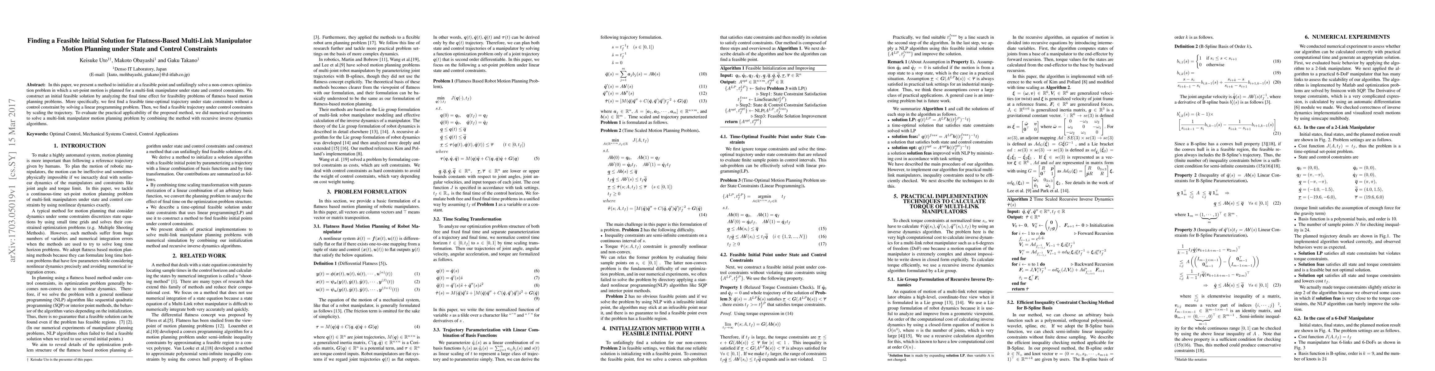 In this paper, we present a method to initialize at a feasible point and unfailingly solve a non-convex optimization problem in which a set-point motion is planned for a multi-link manipulator under state and control constraints. We construct an initial feasible solution by analyzing the final time effect for feasibility problems of flatness based motion planning problems. More specifically, we first find a feasible time-optimal trajectory under state constraints without a control constraint by solving a linear programming problem. Then, we find a feasible trajectory under control constraints by scaling the trajectory. To evaluate the practical applicability of the proposed method, we did numerical experiments to solve a multi-link manipulator motion planning problem by combining the method with recursive inverse dynamics algorithms.