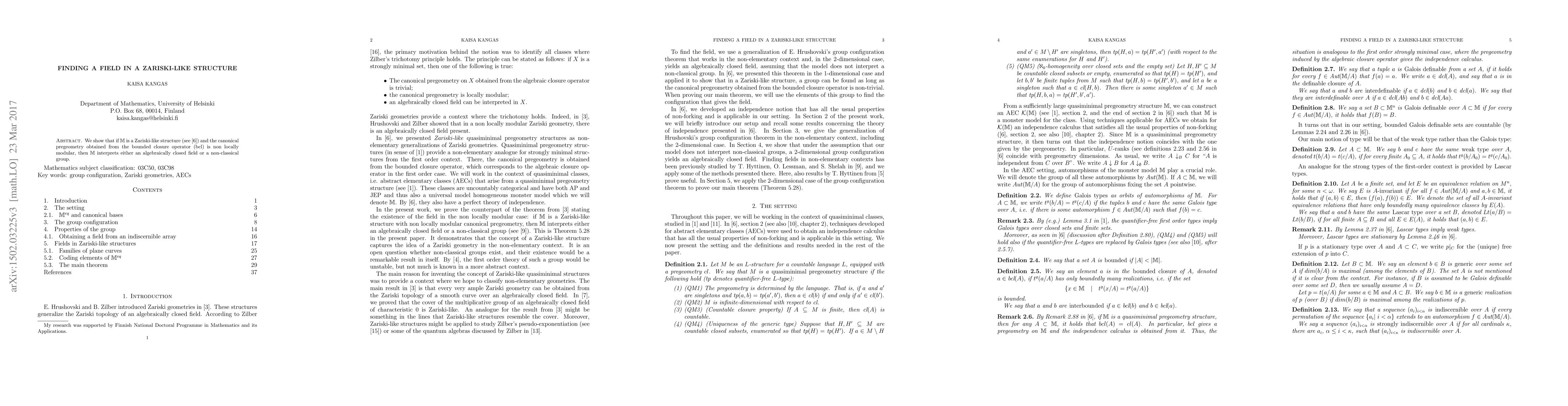 We show that if $\M$ is a Zariski-like structure (see \cite{lisuriart}) that does not interpret a non-classical group, and the canonical pregeometry obtained from the bounded closure operator (bcl) is non locally modular, then $\M$ interprets an algebraically closed field.