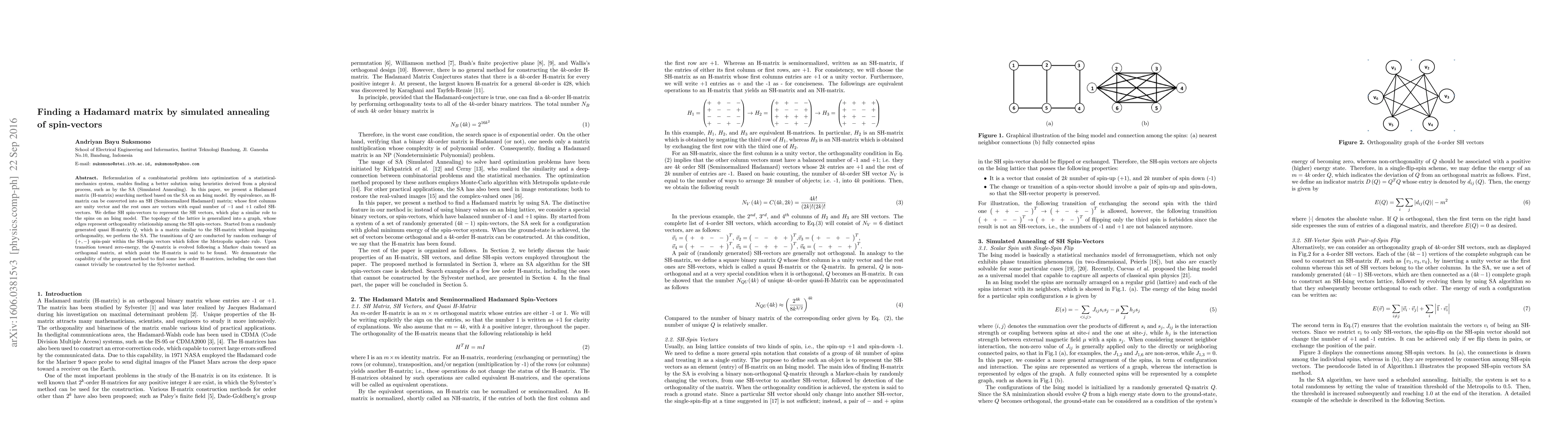 Reformulation of a combinatorial problem into optimization of a statistical-mechanics system, enables finding a better solution using heuristics derived from a physical process, such as by the SA (Simulated Annealing). In this paper, we present a Hadamard matrix (H-matrix) searching method based on the SA on an Ising model. By equivalence, an H-matrix can be converted into an SH (Seminormalized Hadamard) matrix; whose first columns are unity vector and the rest ones are vectors with equal number of -1 and +1 called SH-vectors. We define SH spin-vectors to represent the SH vectors, which play a similar role to the spins on an Ising model. The topology of the lattice is generalized into a graph, whose edges represent orthogonality relationship among the SH spin-vectors. Started from a randomly generated quasi H-matrix Q, which is a matrix similar to the SH-matrix without imposing orthogonality, we perform the SA. The transitions of Q are conducted by random exchange of {+,-} spin-pair within the SH-spin vectors which follow the Metropolis update rule. Upon transition toward zero-energy, the Q-matrix is evolved following a Markov chain toward an orthogonal matrix, at which point the H-matrix is said to be found. We demonstrate the capability of the proposed method to find some low order H-matrices, including the ones that cannot trivially be constructed by the Sylvester method.