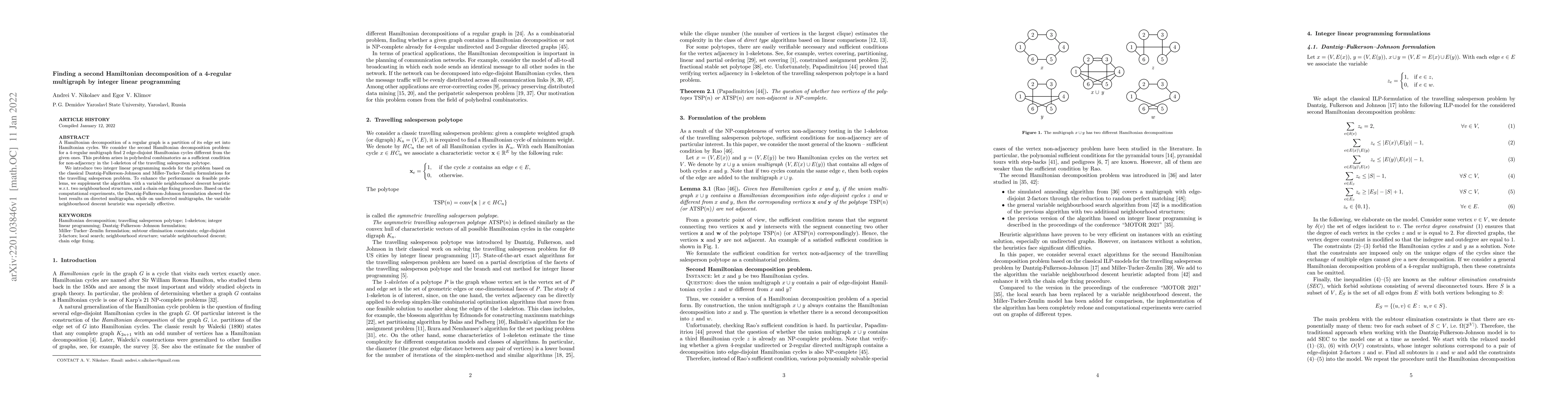 Researchers developed two integer linear programming models to find a second Hamiltonian decomposition of a 4-regular multigraph, with the Dantzig-Fulkerson-Johnson formulation showing best results on directed graphs.