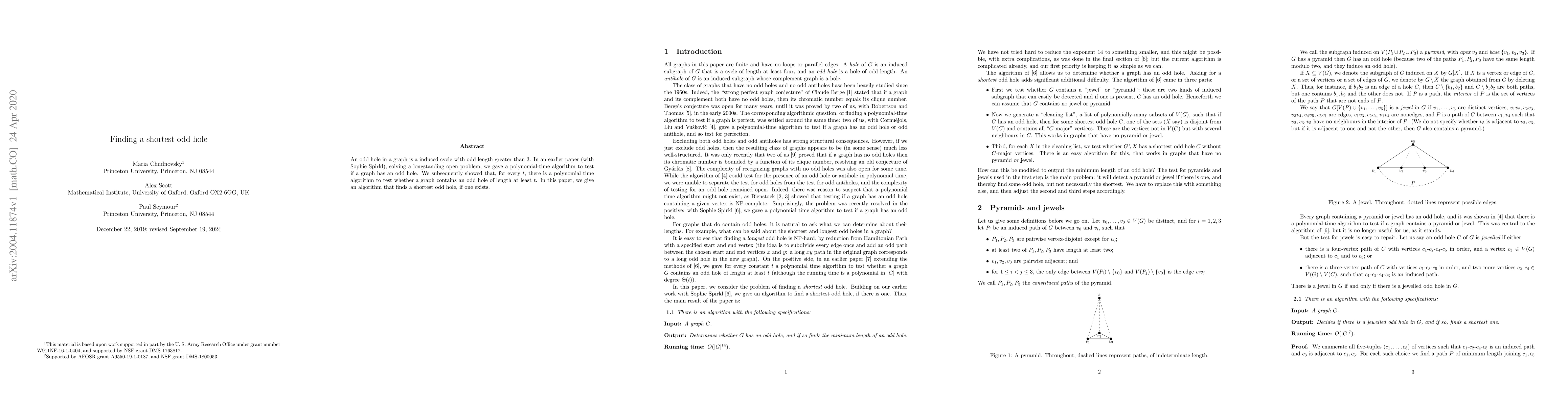 The paper introduces an algorithm for finding the shortest odd hole, extending previous work on detecting odd holes in graphs.