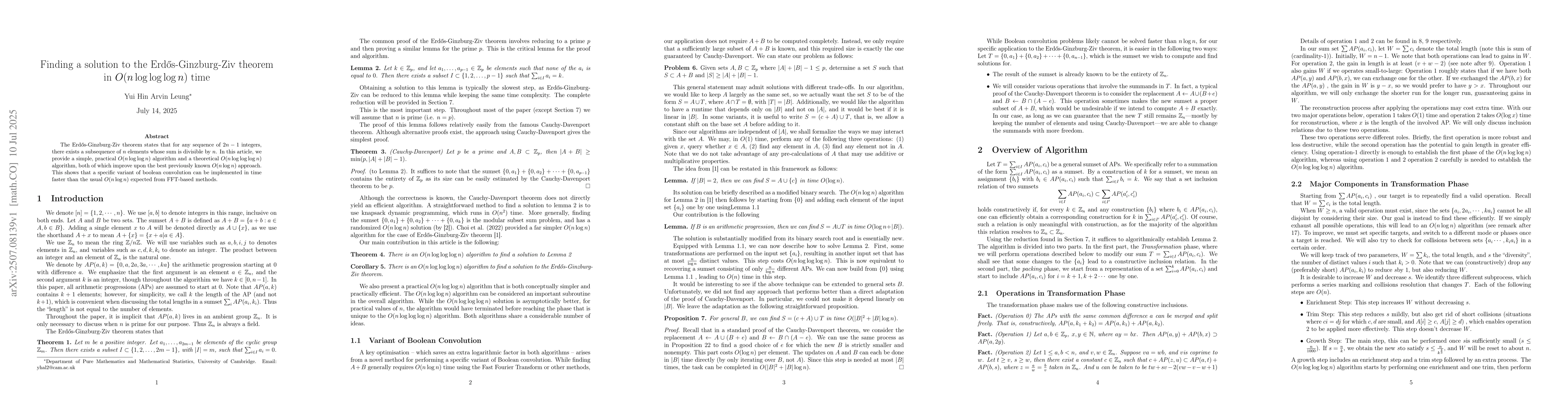 The Erd\H{o}s-Ginzburg-Ziv theorem states that for any sequence of $2n-1$ integers, there exists a subsequence of $n$ elements whose sum is divisible by $n$. In this article, we provide a simple, practical $O(n\log\log n)$ algorithm and a theoretical $O(n\log\log\log n)$ algorithm, both of which improve upon the best previously known $O(n\log n)$ approach. This shows that a specific variant of boolean convolution can be implemented in time faster than the usual $O(n\log n)$ expected from FFT-based methods.