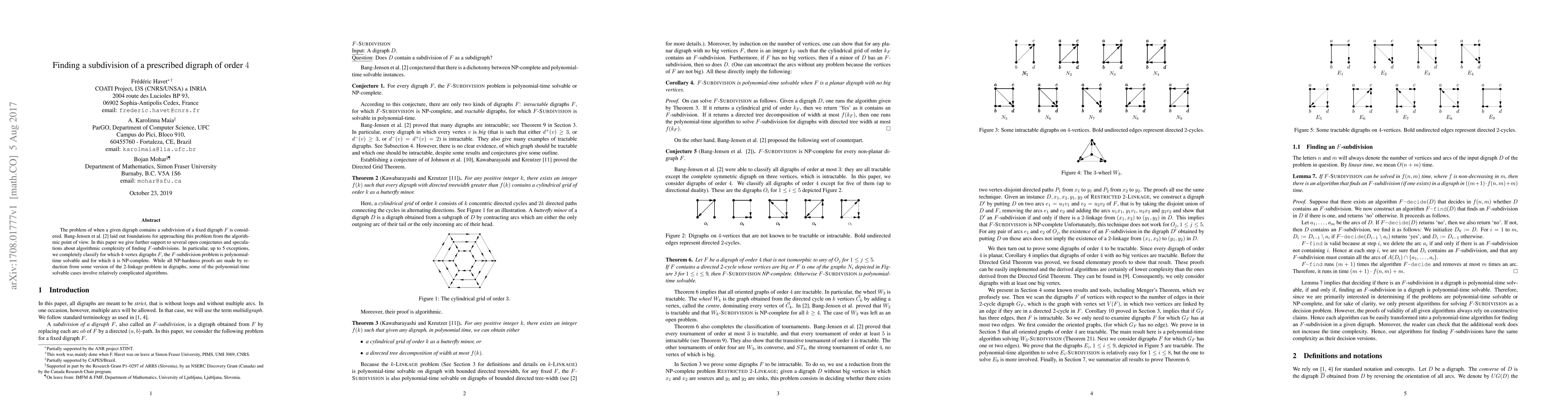 The problem of when a given digraph contains a subdivision of a fixed digraph $F$ is considered. Bang-Jensen et al. laid out foundations for approaching this problem from the algorithmic point of view. In this paper we give further support to several open conjectures and speculations about algorithmic complexity of finding $F$-subdivisions. In particular, up to 5 exceptions, we completely classify for which 4-vertex digraphs $F$, the $F$-subdivision problem is polynomial-time solvable and for which it is NP-complete. While all NP-hardness proofs are made by reduction from some version of the 2-linkage problem in digraphs, some of the polynomial-time solvable cases involve relatively complicated algorithms.