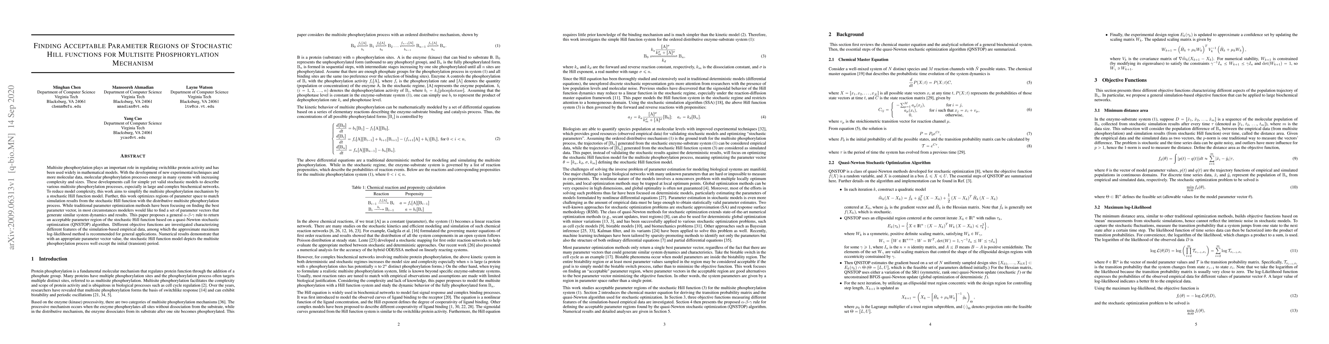 This paper simplifies multisite phosphorylation mechanisms using a stochastic Hill function model and optimizes parameter regions to match simulation results. It proposes an $\alpha$-$\beta$-$\gamma$ rule with a quasi-Newton stochastic optimization algorithm to identify acceptable parameter regions, recommending the approximate maximum log-likelihood method for general applications.