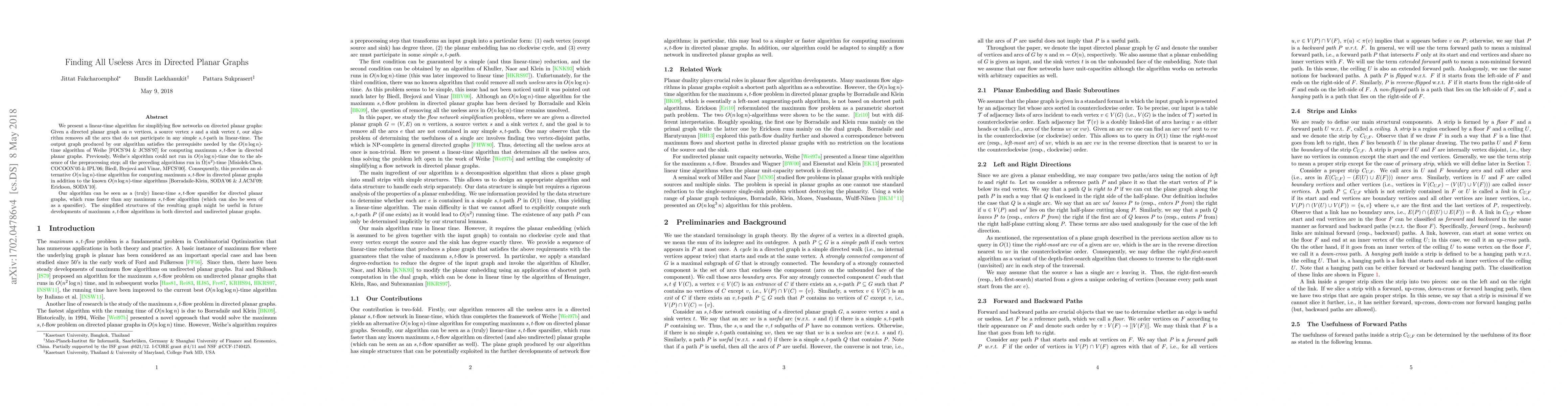 This paper presents a linear-time algorithm to remove all arcs in directed planar graphs that do not contribute to any simple path from a source to a sink, thus simplifying the flow network. This preprocessing step enables an alternative $O(n\log n)$-time algorithm for computing maximum $s,t$-flow in directed planar graphs, improving upon previous $\tilde{\Omega}(n^2)$-time methods.