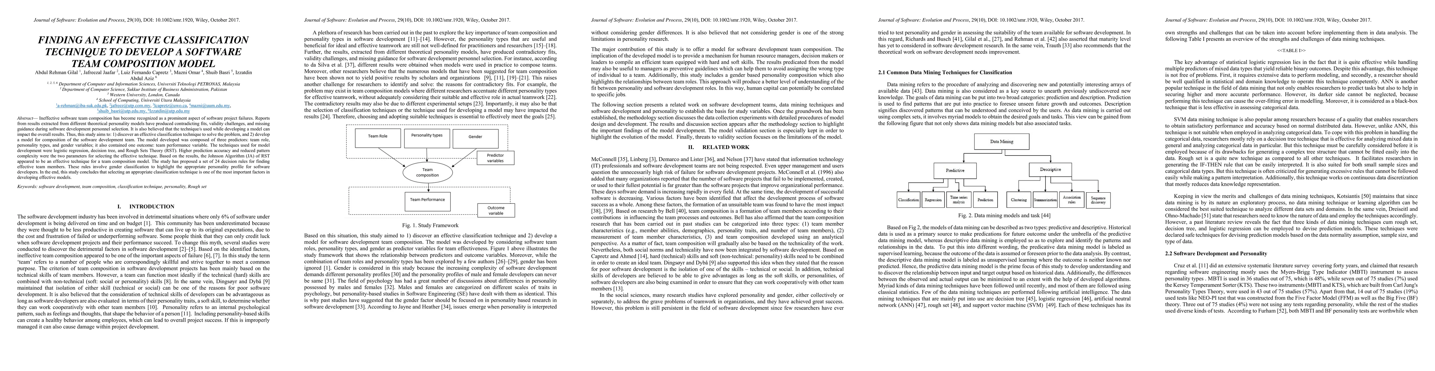A study developed an effective team composition model using three predictors: team role, personality types, and gender variables. The Johnson Algorithm of Rough Sets Theory was found to be the most accurate technique for predicting team performance.
