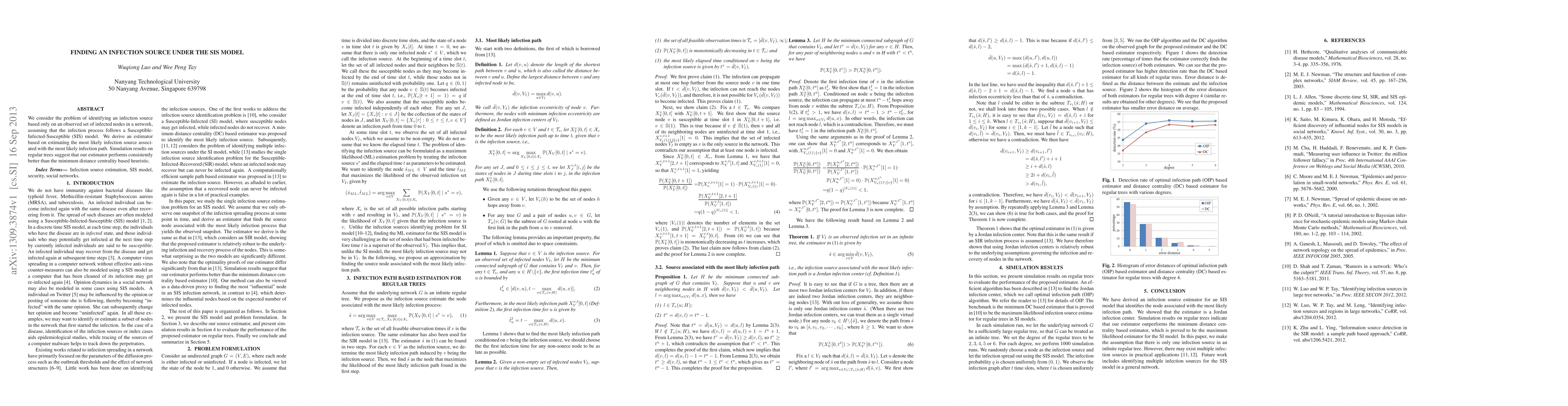 This paper proposes an estimator for identifying the most likely infection source in a network under the SIS model, based on the most probable infection path. Simulation results on regular trees show that this estimator outperforms a minimum distance centrality heuristic.