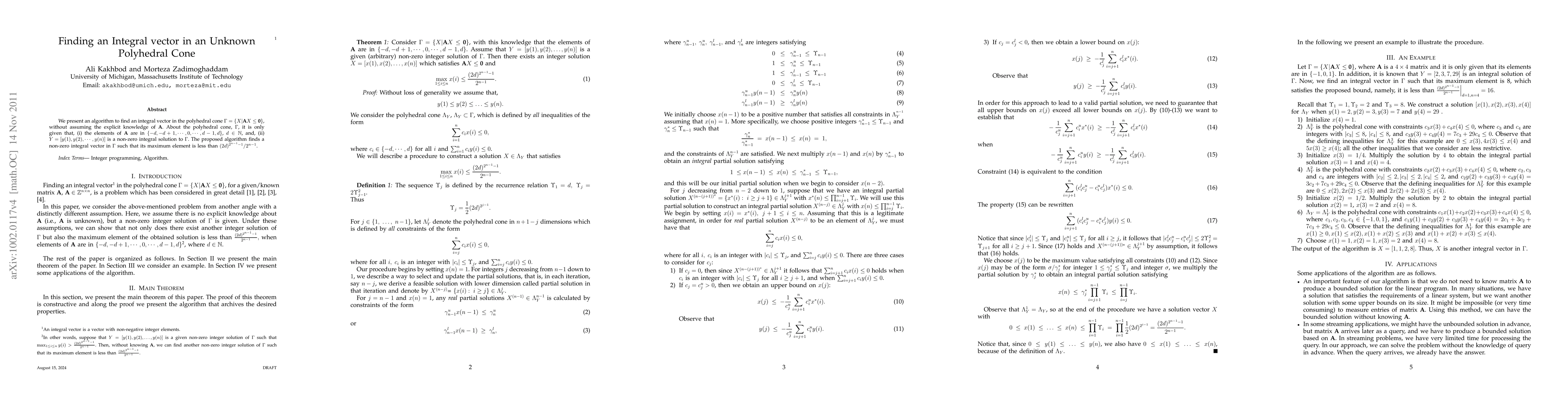 We present an algorithm to find an integral vector in the polyhedral cone $\Gamma=\{X | \textbf{A}X \leq \textbf{0}\}$, without assuming the explicit knowledge of $\textbf{A}$. About the polyhedral cone, $\Gamma$, it is only given that, (i) the elements of \textbf{A} are in $\{-d,-d+1,\...,0,\...,d-1,d\}$, $d \in \mathbb{N}$, and, (ii) $Y=[y(1),y(2),\...,y(n)]$ is a non-zero integral solution to $\Gamma$. The proposed algorithm finds a non-zero integral vector in $\Gamma$ such that its maximum element is less than ${(2d)^{2^{n-1}-1}}/{2^{n-1}}$.
