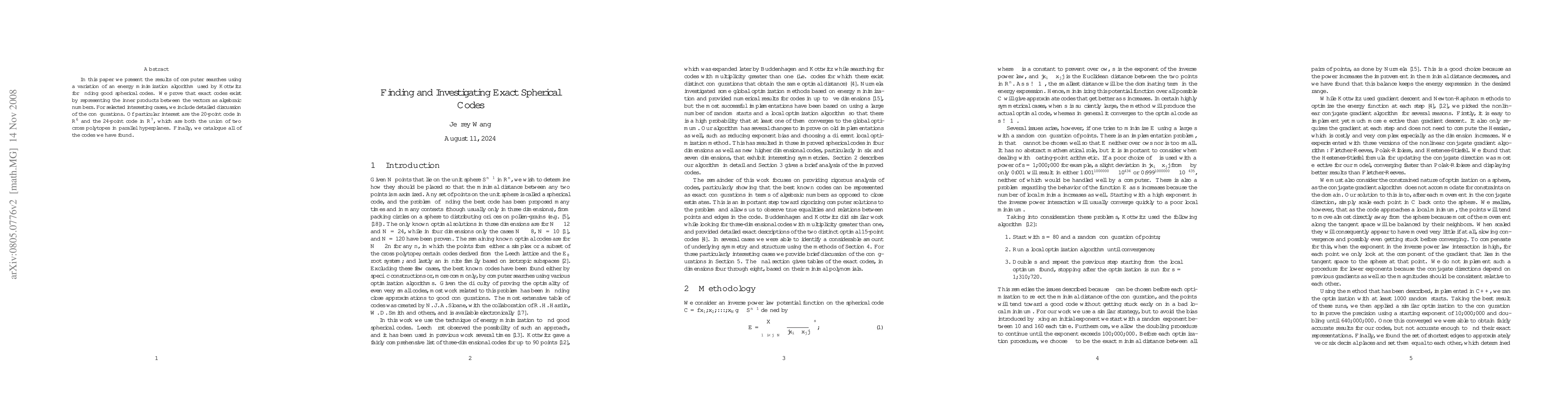 In this paper we present the results of computer searches using a variation of an energy minimization algorithm used by Kottwitz for finding good spherical codes. We prove that exact codes exist by representing the inner products between the vectors as algebraic numbers. For selected interesting cases, we include detailed discussion of the configurations. Of particular interest are the 20-point code in $\mathbb{R}^6$ and the 24-point code in $\mathbb{R}^7$, which are both the union of two cross polytopes in parallel hyperplanes. Finally, we catalogue all of the codes we have found.