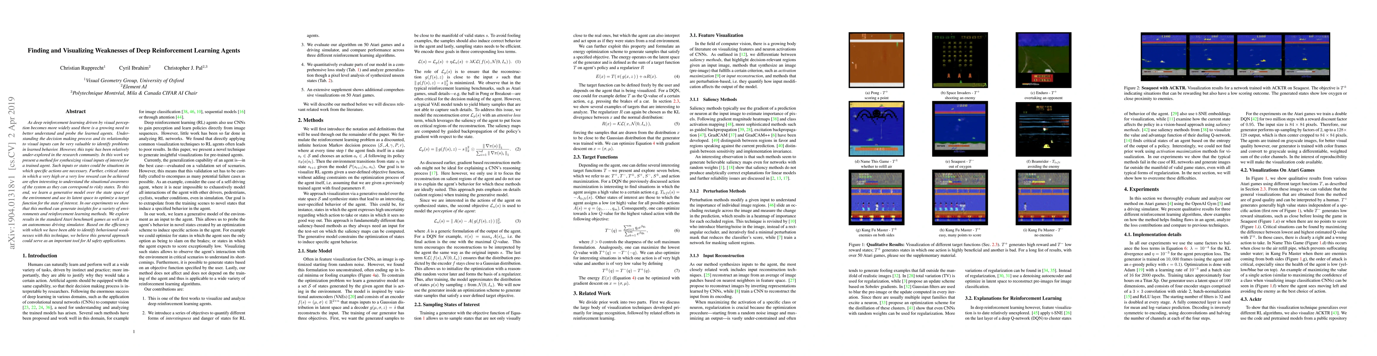 The paper presents a method for synthesizing visual inputs of interest for a trained Deep Reinforcement Learning (DRL) agent by learning a generative model over the state space of the environment and optimizing a target function in its latent space.