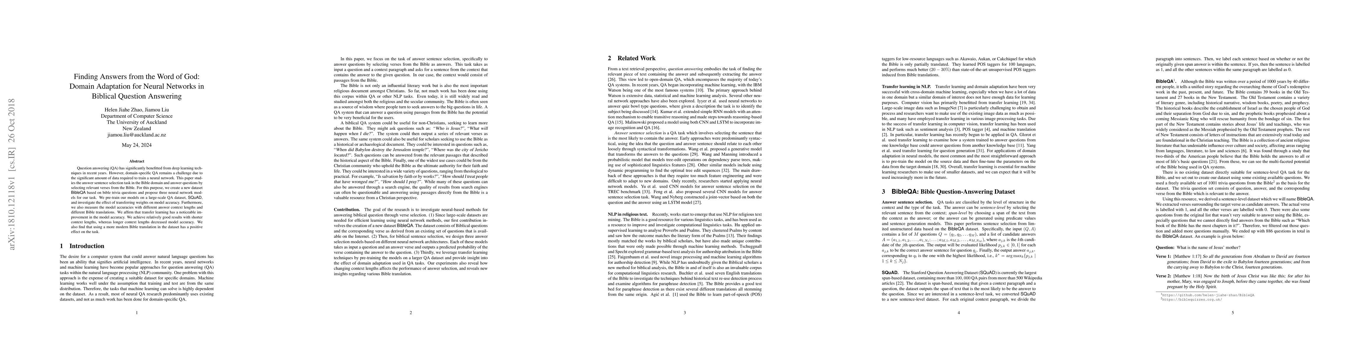 This paper explores domain adaptation for neural networks in biblical question answering, introducing a new dataset BibleQA. It proposes three neural network models pre-trained on SQuAD and finds that transfer learning significantly improves accuracy, especially with shorter context lengths and more modern Bible translations.