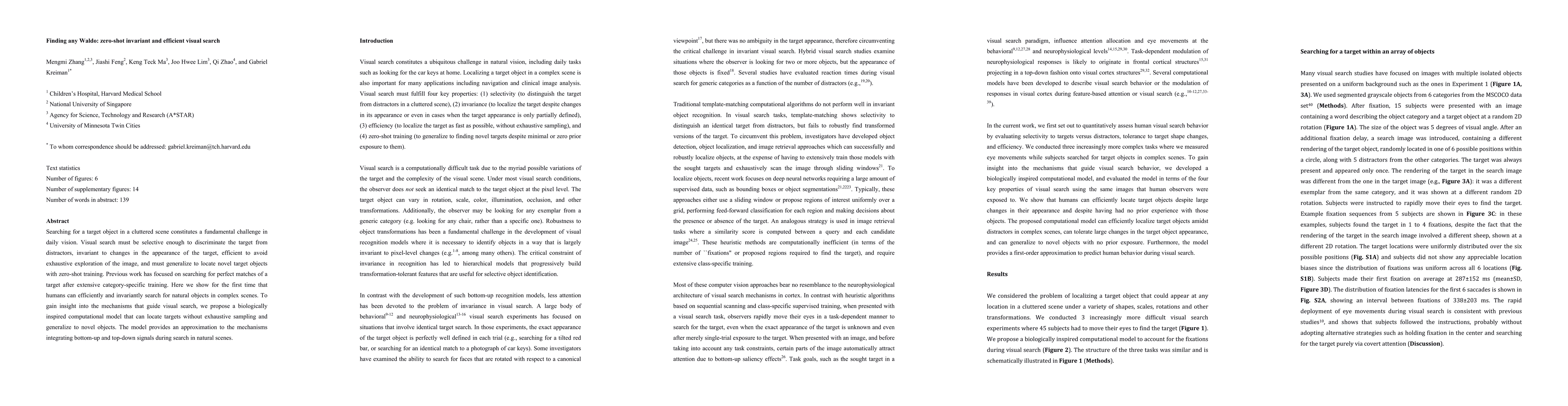 This paper presents a biologically inspired computational model that enables efficient and invariant visual search for natural objects in complex scenes, demonstrating the ability to generalize to novel targets without prior training. The model approximates human mechanisms integrating bottom-up and top-down signals during search.