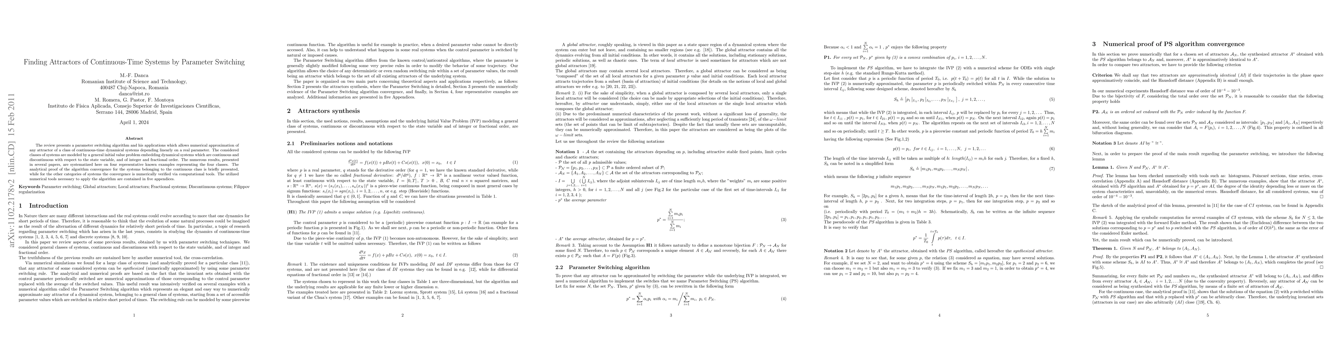 The review presents a parameter switching algorithm and his applications which allows numerical approximation of any attractor of a class of continuous-time dynamical systems depending linearly on a real parameter. The considered classes of systems are modeled by a general initial value problem embedding dynamical systems which are continuous and discontinuous with respect to the state variable, and of integer and fractional order. The numerous results, presented in several papers, are systematized here on four representative known examples representing the four classes. The analytical proof of the algorithm convergence for the systems belonging to the continuous class is briefly presented, while for the other categories of systems the convergence is numerically verified via computational tools. The utilized numerical tools necessary to apply the algorithm are contained in five appendices.