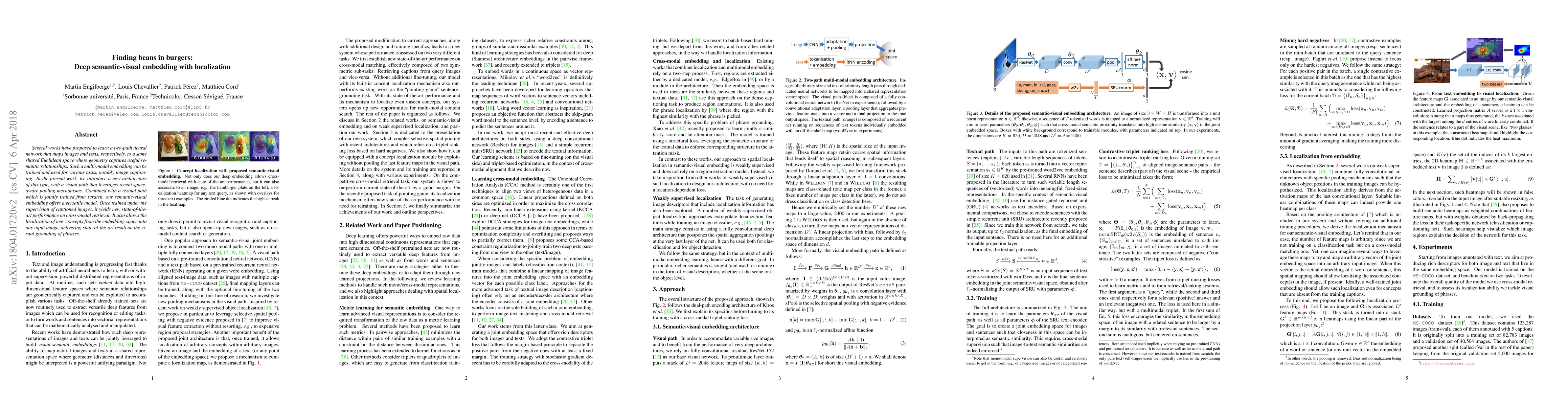 This paper proposes a new neural network architecture for semantic-visual embedding that combines space-aware pooling with a jointly trained textual path, achieving state-of-the-art performance in cross-modal retrieval and visual grounding of phrases. The model localizes new concepts within images, enhancing its versatility for various tasks.