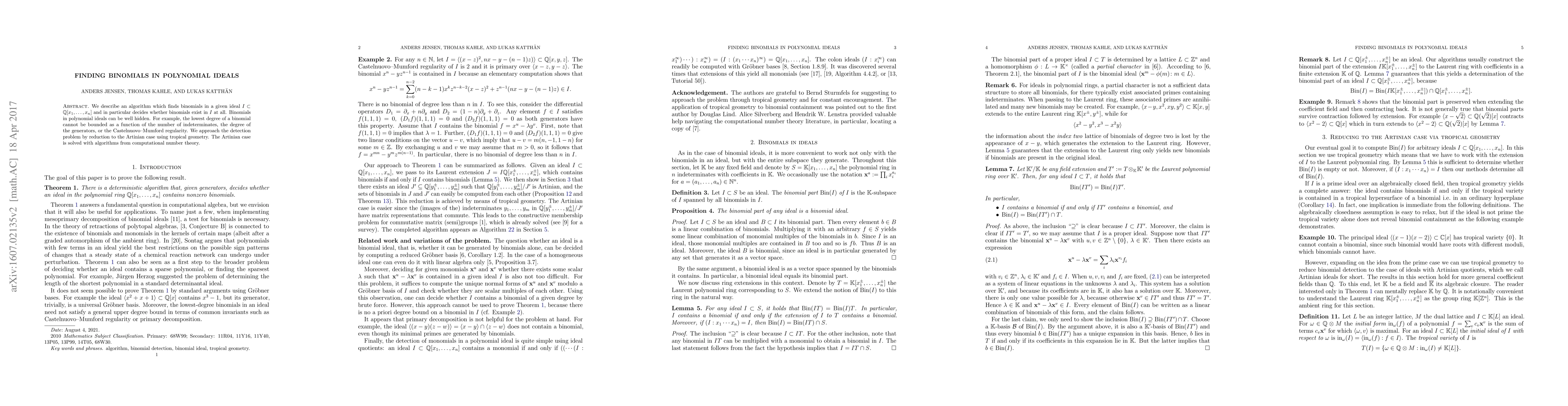 This paper presents an algorithm to detect binomials within polynomial ideals in $\mathbb{Q}[x_1,\dots,x_n]$ and determines if any binomials exist. It leverages tropical geometry to reduce the problem to the Artinian case, which is then solved using computational number theory techniques.