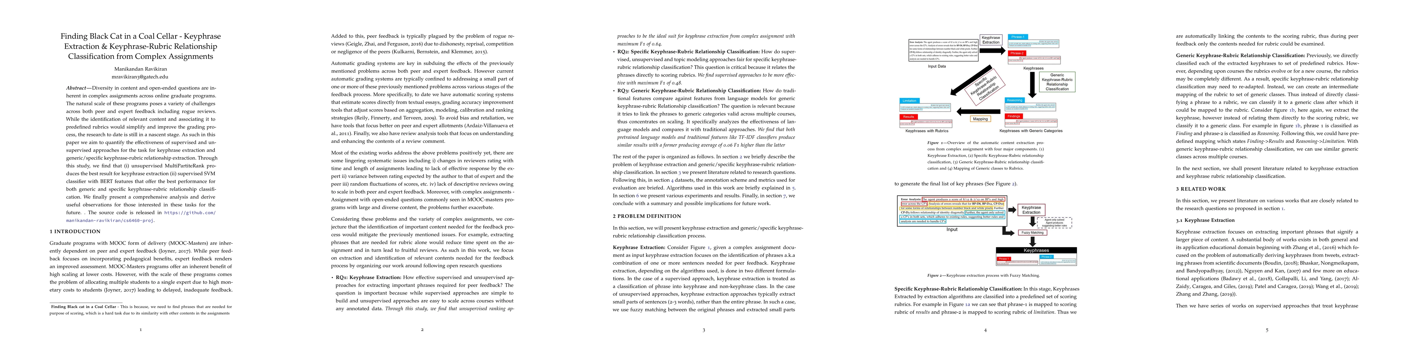 Diversity in content and open-ended questions are inherent in complex assignments across online graduate programs. The natural scale of these programs poses a variety of challenges across both peer and expert feedback including rogue reviews. While the identification of relevant content and associating it to predefined rubrics would simplify and improve the grading process, the research to date is still in a nascent stage. As such in this paper we aim to quantify the effectiveness of supervised and unsupervised approaches for the task for keyphrase extraction and generic/specific keyphrase-rubric relationship extraction. Through this study, we find that (i) unsupervised MultiPartiteRank produces the best result for keyphrase extraction (ii) supervised SVM classifier with BERT features that offer the best performance for both generic and specific keyphrase-rubric relationship classification. We finally present a comprehensive analysis and derive useful observations for those interested in these tasks for the future. The source code is released in \url{https://github.com/manikandan-ravikiran/cs6460-proj}.