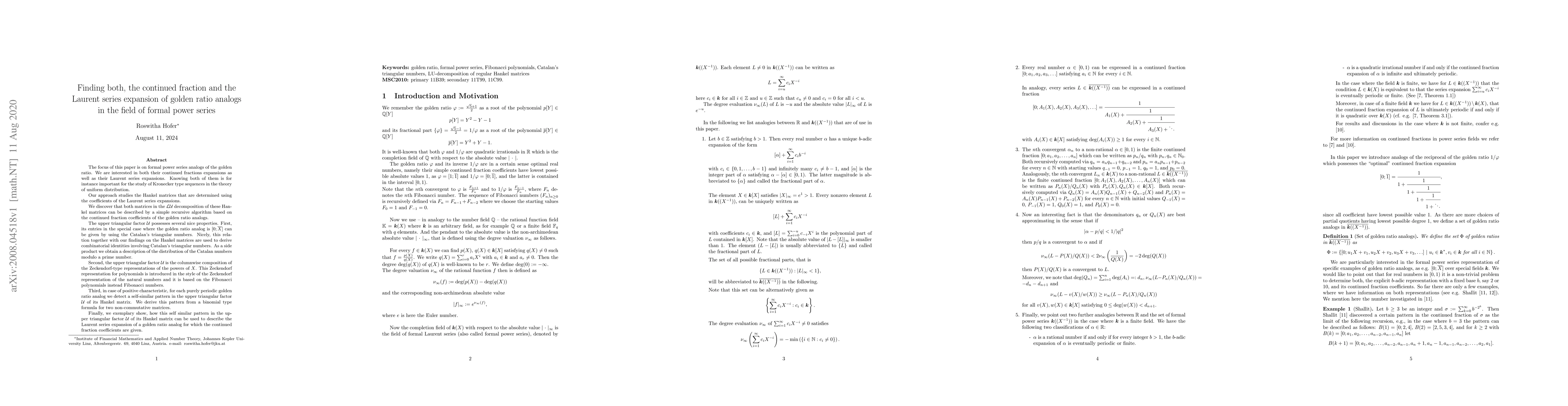 This paper investigates formal power series analogs of the golden ratio, focusing on their continued fraction and Laurent series expansions. It employs Hankel matrices derived from the coefficients of the Laurent series to achieve this.
