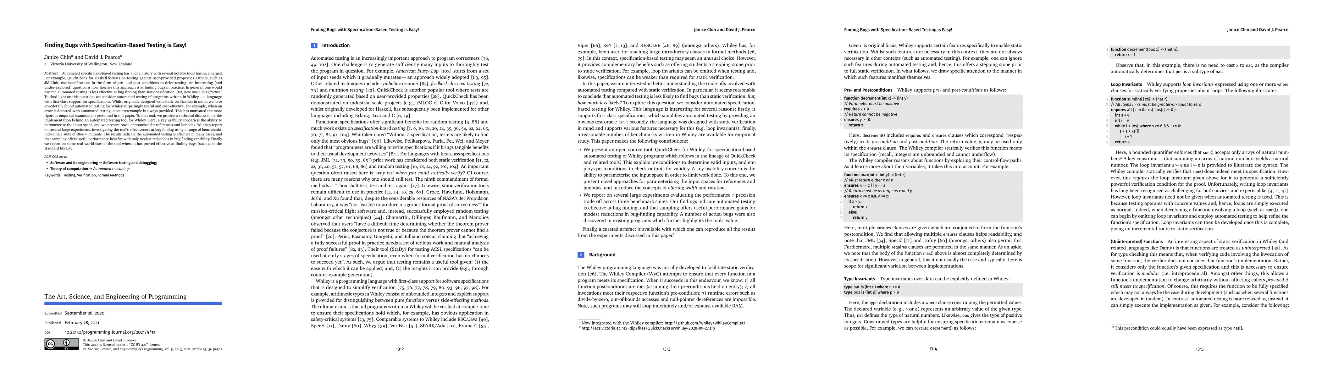 Automated specification-based testing found to be effective in finding bugs in Whiley programs, with sampling offering useful performance benefits and modest reductions in bug-finding capability.