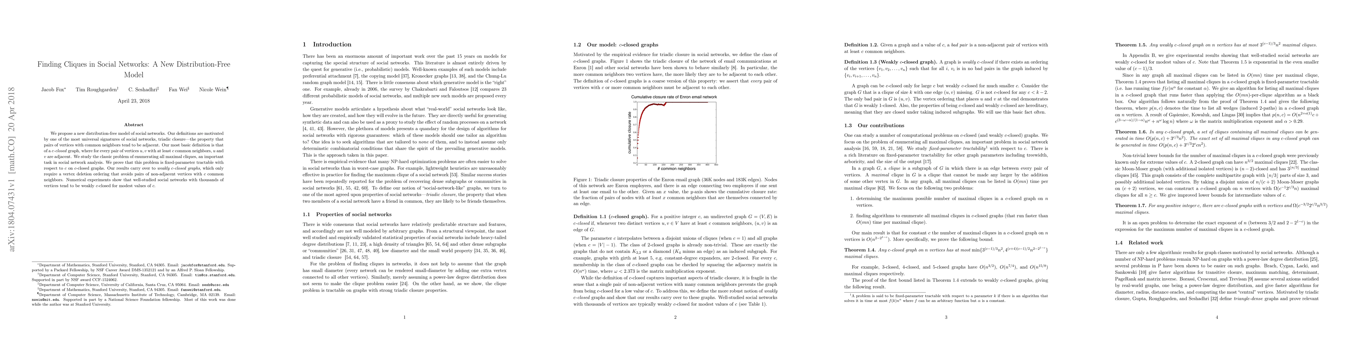 This paper introduces a new distribution-free model for social networks based on triadic closure, defining "$c$-closed" graphs where pairs of vertices with at least $c$ common neighbors are adjacent. It demonstrates that enumerating maximal cliques in these graphs is fixed-parameter tractable, with results extending to "weakly $c$-closed graphs."