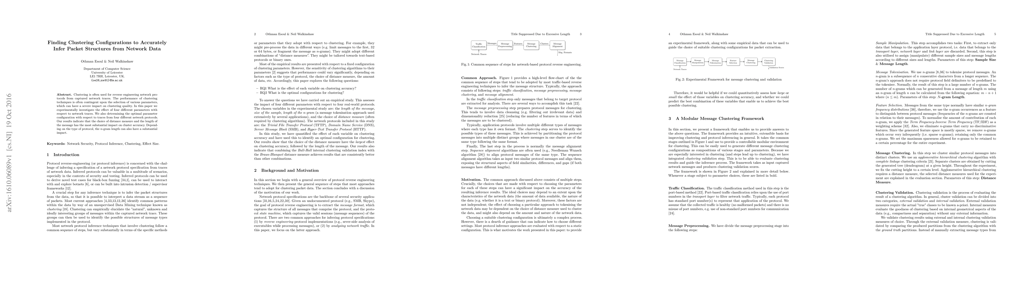 The paper investigates the impact of four parameters on clustering techniques used to reverse-engineer network protocols from captured network traces. It finds that distance measure and message length have the most substantial impact on cluster accuracy, varying by protocol type.