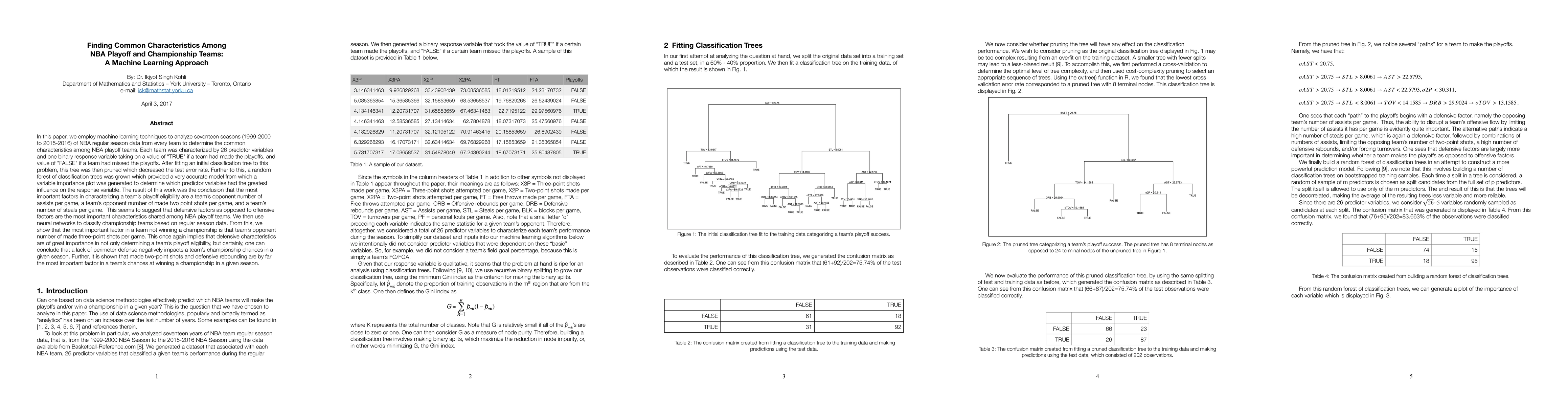 This paper uses machine learning to identify common characteristics among NBA playoff and championship teams, finding that defensive factors like opponent assists and steals are crucial for playoff eligibility, while a lack of perimeter defense and importance of made two-point shots and defensive rebounding are key for championship success.