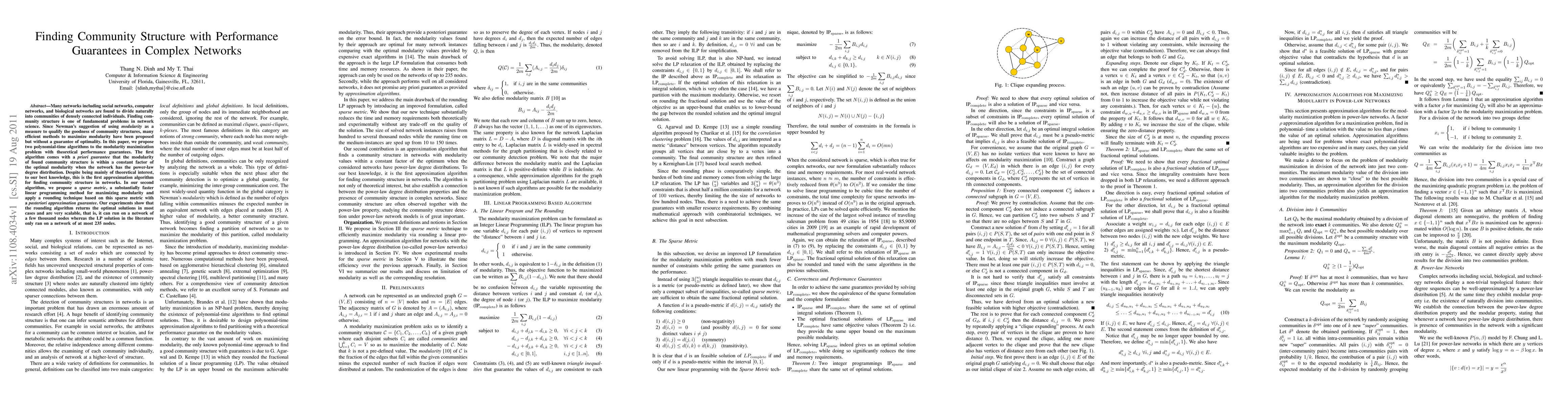 Many networks including social networks, computer networks, and biological networks are found to divide naturally into communities of densely connected individuals. Finding community structure is one of fundamental problems in network science. Since Newman's suggestion of using \emph{modularity} as a measure to qualify the goodness of community structures, many efficient methods to maximize modularity have been proposed but without a guarantee of optimality. In this paper, we propose two polynomial-time algorithms to the modularity maximization problem with theoretical performance guarantees. The first algorithm comes with a \emph{priori guarantee} that the modularity of found community structure is within a constant factor of the optimal modularity when the network has the power-law degree distribution. Despite being mainly of theoretical interest, to our best knowledge, this is the first approximation algorithm for finding community structure in networks. In our second algorithm, we propose a \emph{sparse metric}, a substantially faster linear programming method for maximizing modularity and apply a rounding technique based on this sparse metric with a \emph{posteriori approximation guarantee}. Our experiments show that the rounding algorithm returns the optimal solutions in most cases and are very scalable, that is, it can run on a network of a few thousand nodes whereas the LP solution in the literature only ran on a network of at most 235 nodes.