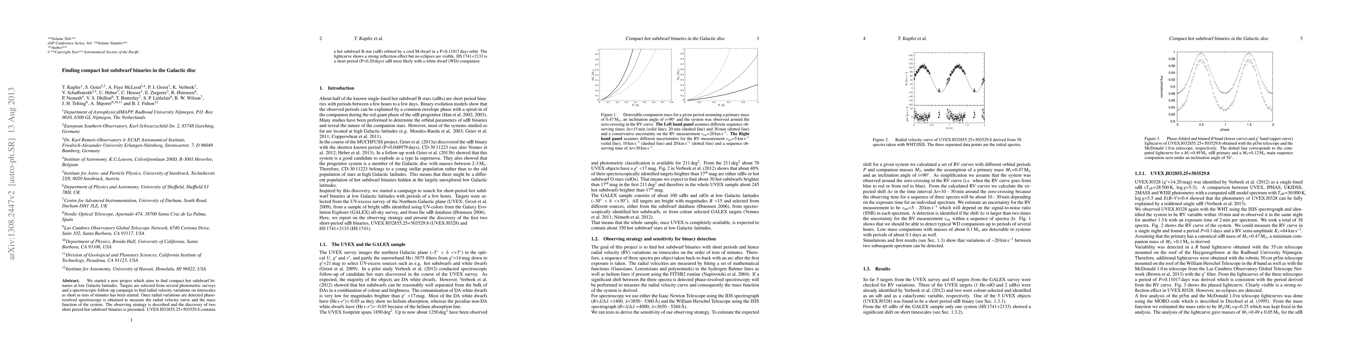 This research project identifies compact hot subdwarf binaries in the Galactic disc using photometric surveys and spectroscopic follow-up. The study discovered two short-period binaries, including UVEXJ032855.25+503529.8 with a sdB star and an M-dwarf, and HS 1741+2133 with a sdB star and likely a white dwarf companion.