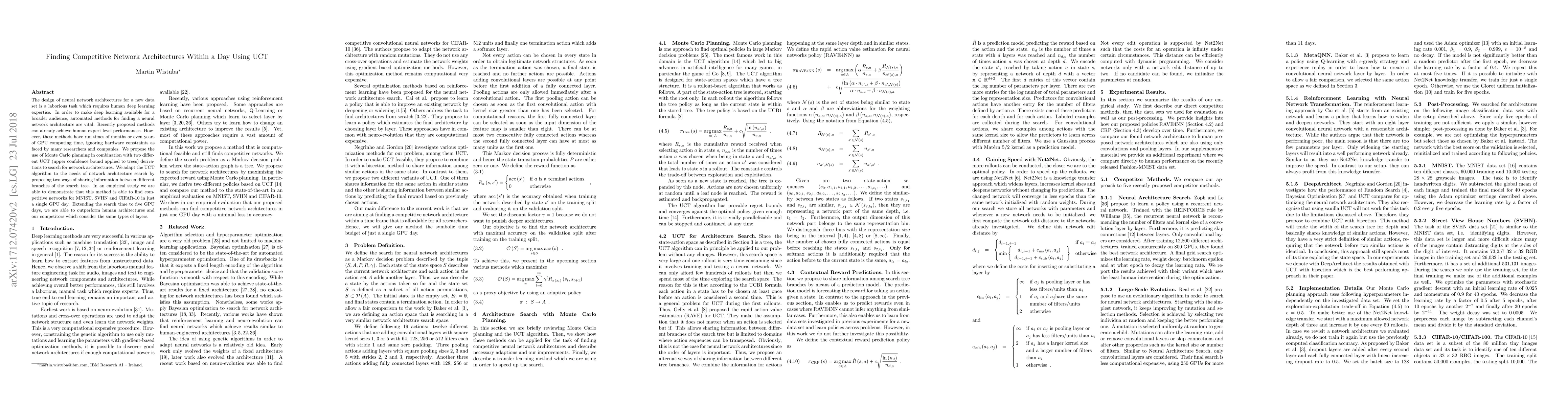 This paper proposes a method using Monte Carlo planning and UCT algorithms to quickly find competitive neural network architectures, achieving human-expert level performance in a single GPU day for datasets like MNIST, SVHN, and CIFAR-10, while outperforming existing methods when extended to five GPU days.