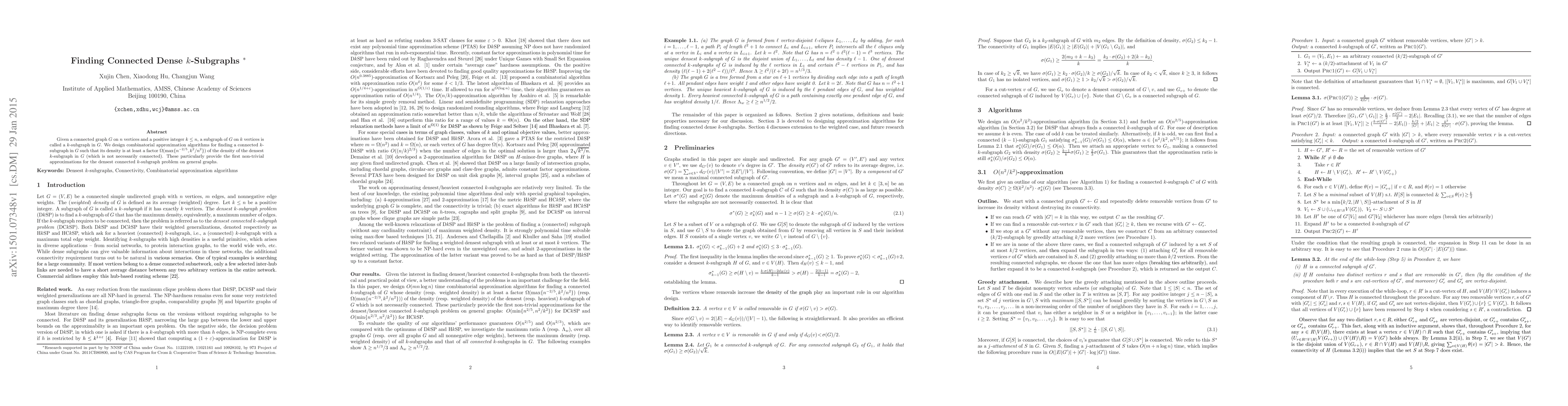 The paper presents combinatorial approximation algorithms for finding a connected $k$-subgraph in a given graph $G$ with $n$ vertices, ensuring its density is at least a factor $\Omega(\max\{n^{-2/5},k^2/n^2\})$ of the density of the densest $k$-subgraph in $G$ (which is not necessarily connected).
