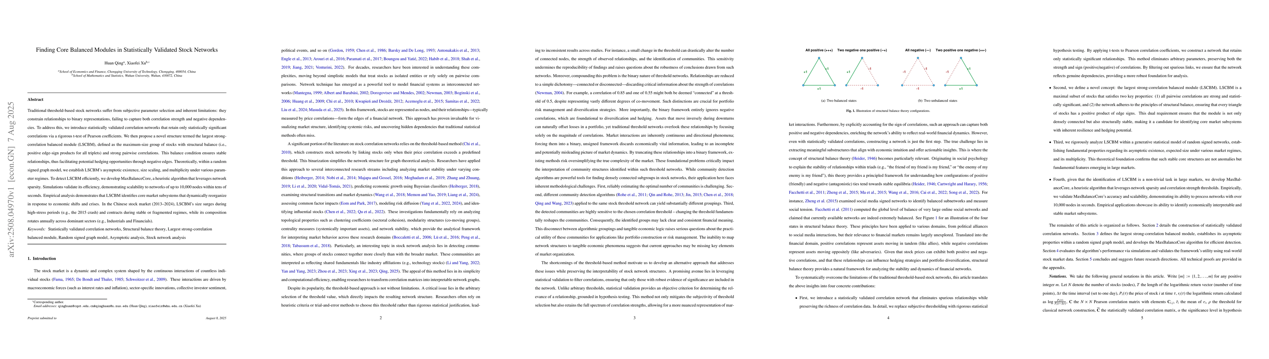 Traditional threshold-based stock networks suffer from subjective parameter selection and inherent limitations: they constrain relationships to binary representations, failing to capture both correlation strength and negative dependencies. To address this, we introduce statistically validated correlation networks that retain only statistically significant correlations via a rigorous t-test of Pearson coefficients. We then propose a novel structure termed the largest strong-correlation balanced module (LSCBM), defined as the maximum-size group of stocks with structural balance (i.e., positive edge-ign products for all triplets) and strong pairwise correlations. This balance condition ensures stable relationships, thus facilitating potential hedging opportunities through negative edges. Theoretically, within a random signed graph model, we establish LSCBM's asymptotic existence, size scaling, and multiplicity under various parameter regimes. To detect LSCBM efficiently, we develop MaxBalanceCore, a heuristic algorithm that leverages network sparsity. Simulations validate its efficiency, demonstrating scalability to networks of up to 10,000 nodes within tens of seconds. Empirical analysis demonstrates that LSCBM identifies core market subsystems that dynamically reorganize in response to economic shifts and crises. In the Chinese stock market (2013-2024), LSCBM's size surges during high-stress periods (e.g., the 2015 crash) and contracts during stable or fragmented regimes, while its composition rotates annually across dominant sectors (e.g., Industrials and Financials).