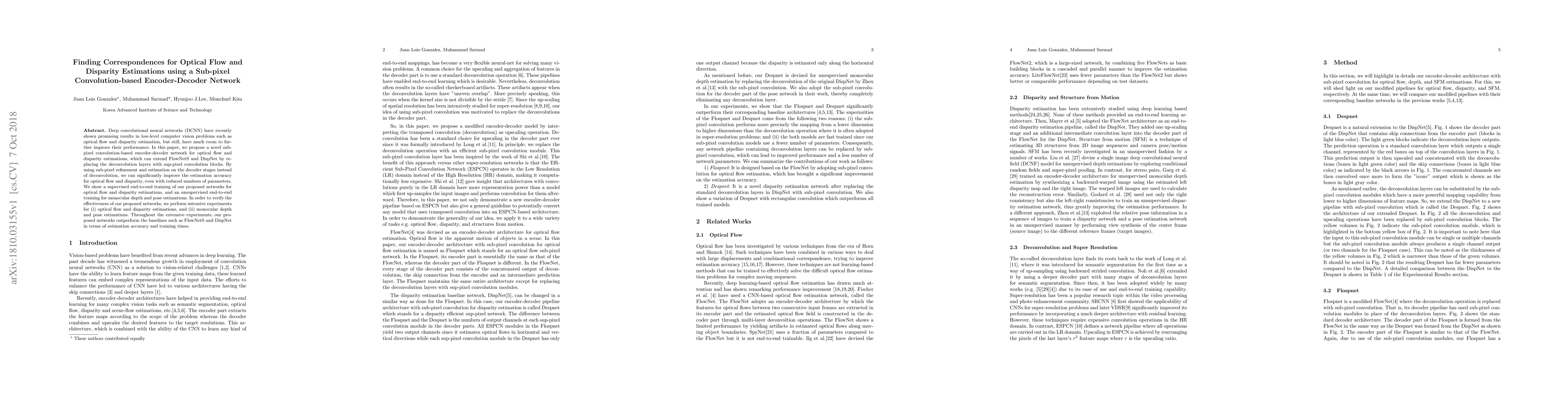 This paper proposes a sub-pixel convolution-based encoder-decoder network to enhance optical flow and disparity estimations, replacing deconvolution layers with sub-pixel convolution blocks for improved accuracy and efficiency. The network outperforms baselines like FlowNetS and DispNet in accuracy and training time.