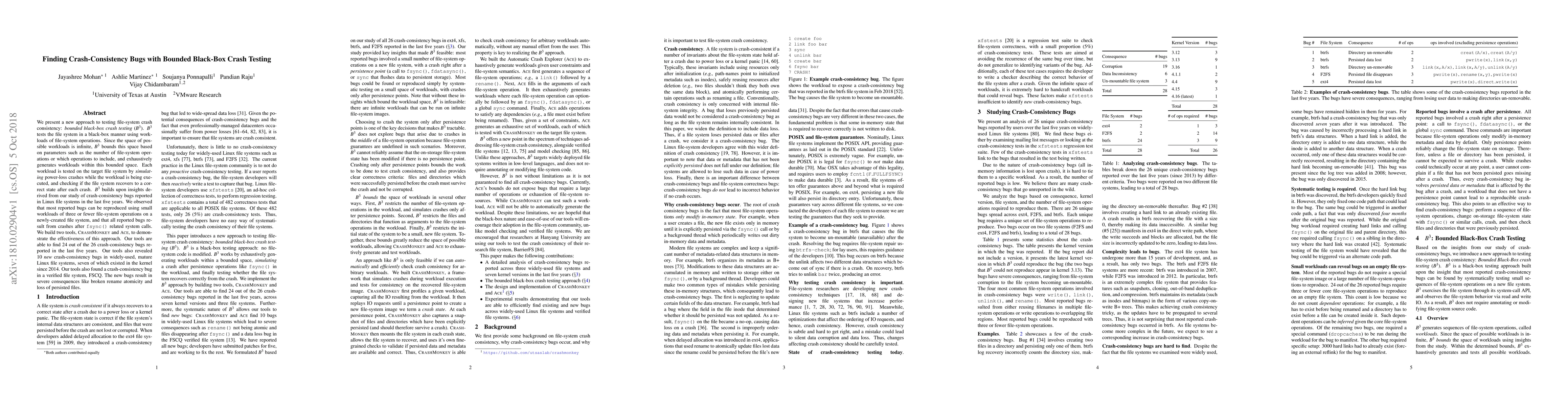This paper introduces bounded black-box crash testing (B3) to identify file-system crash-consistency bugs by simulating power-loss crashes during file-system operations. The approach effectively reproduces and finds most reported bugs, revealing 10 new severe bugs in mature Linux file systems, including some undetected since 2014.