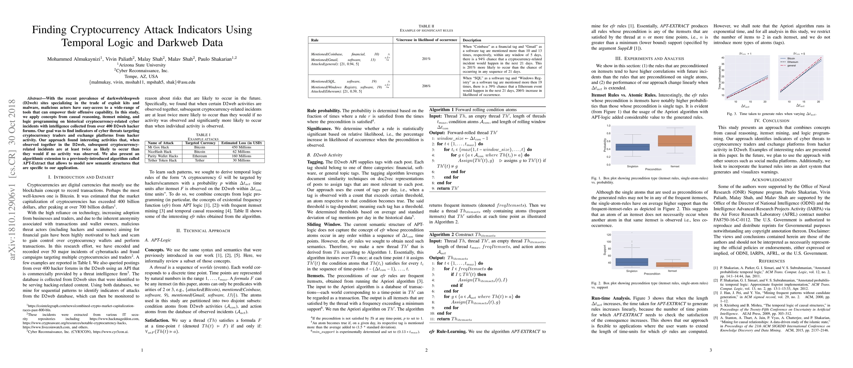 This study uses darkweb data and temporal logic to identify indicators of cryptocurrency cyber threats. The methodology combines causal reasoning, itemset mining, and logic programming on historical incidents from over 400 D2web hacker forums. The findings reveal that specific observed activities on the darkweb increase the likelihood of subsequent cryptocurrency-related incidents by at least double, with an algorithmic extension to APT-Extract for modeling application-specific structures.