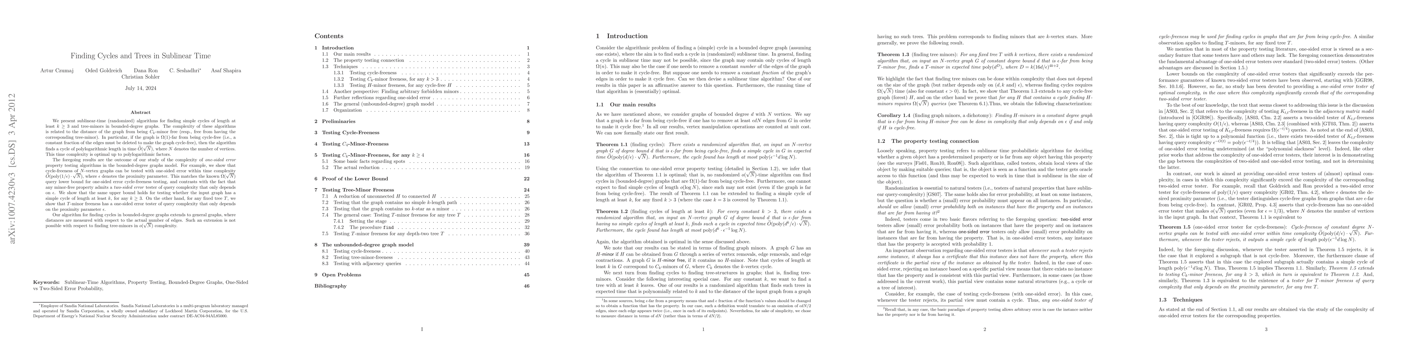 We present sublinear-time (randomized) algorithms for finding simple cycles of length at least $k\geq 3$ and tree-minors in bounded-degree graphs. The complexity of these algorithms is related to the distance of the graph from being $C_k$-minor-free (resp., free from having the corresponding tree-minor). In particular, if the graph is far (i.e., $\Omega(1)$-far) {from} being cycle-free, i.e. if one has to delete a constant fraction of edges to make it cycle-free, then the algorithm finds a cycle of polylogarithmic length in time $\tildeO(\sqrt{N})$, where $N$ denotes the number of vertices. This time complexity is optimal up to polylogarithmic factors. The foregoing results are the outcome of our study of the complexity of {\em one-sided error} property testing algorithms in the bounded-degree graphs model. For example, we show that cycle-freeness of $N$-vertex graphs can be tested with one-sided error within time complexity $\tildeO(\poly(1/\e)\cdot\sqrt{N})$. This matches the known $\Omega(\sqrt{N})$ query lower bound, and contrasts with the fact that any minor-free property admits a {\em two-sided error} tester of query complexity that only depends on the proximity parameter $\e$. For any constant $k\geq3$, we extend this result to testing whether the input graph has a simple cycle of length at least $k$. On the other hand, for any fixed tree $T$, we show that $T$-minor-freeness has a one-sided error tester of query complexity that only depends on the proximity parameter $\e$. Our algorithm for finding cycles in bounded-degree graphs extends to general graphs, where distances are measured with respect to the actual number of edges. Such an extension is not possible with respect to finding tree-minors in $o(\sqrt{N})$ complexity.