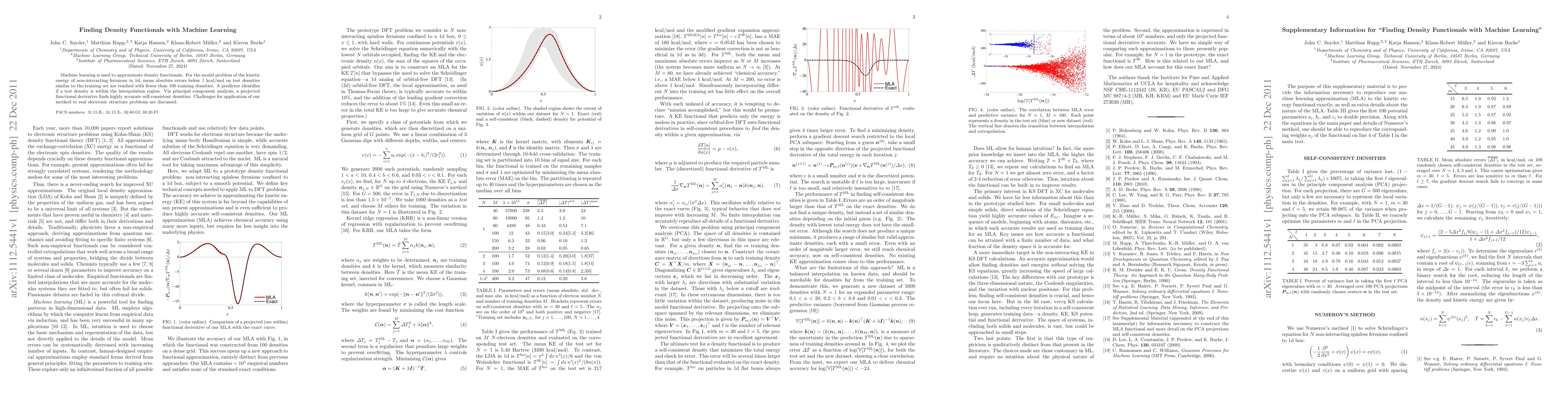 This paper employs machine learning to approximate density functionals, achieving mean absolute errors below 1 kcal/mol for the kinetic energy of non-interacting fermions in 1d with minimal training data. The method uses a predictor to identify interpolation regions and PCA for accurate self-consistent densities, though challenges remain for broader electronic structure applications.