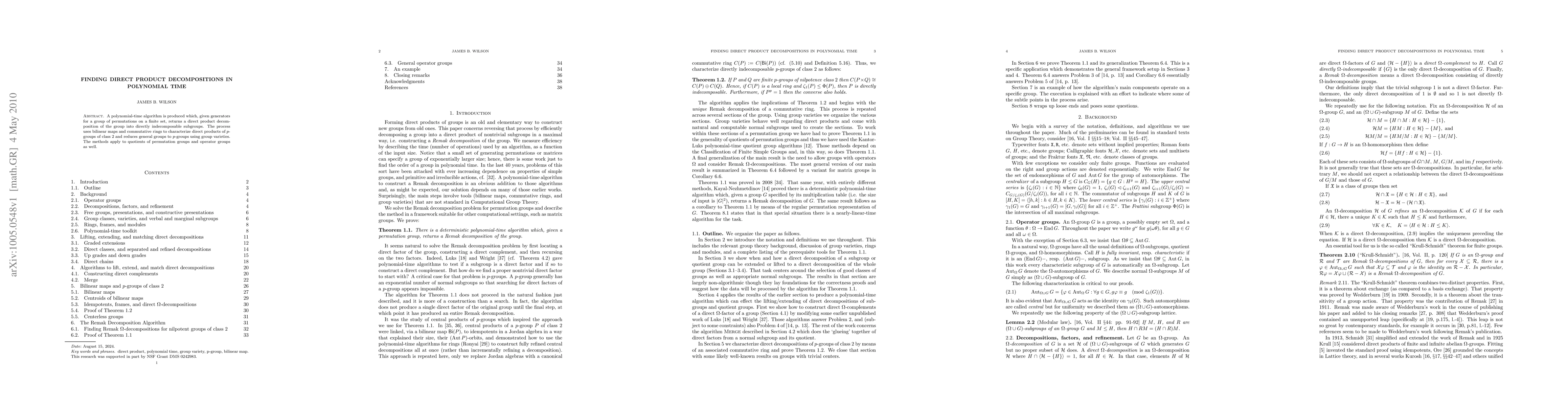 A polynomial-time algorithm is produced which, given generators for a group of permutations on a finite set, returns a direct product decomposition of the group into directly indecomposable subgroups. The process uses bilinear maps and commutative rings to characterize direct products of p-groups of class 2 and reduces general groups to p-groups using group varieties. The methods apply to quotients of permutation groups and operator groups as well.