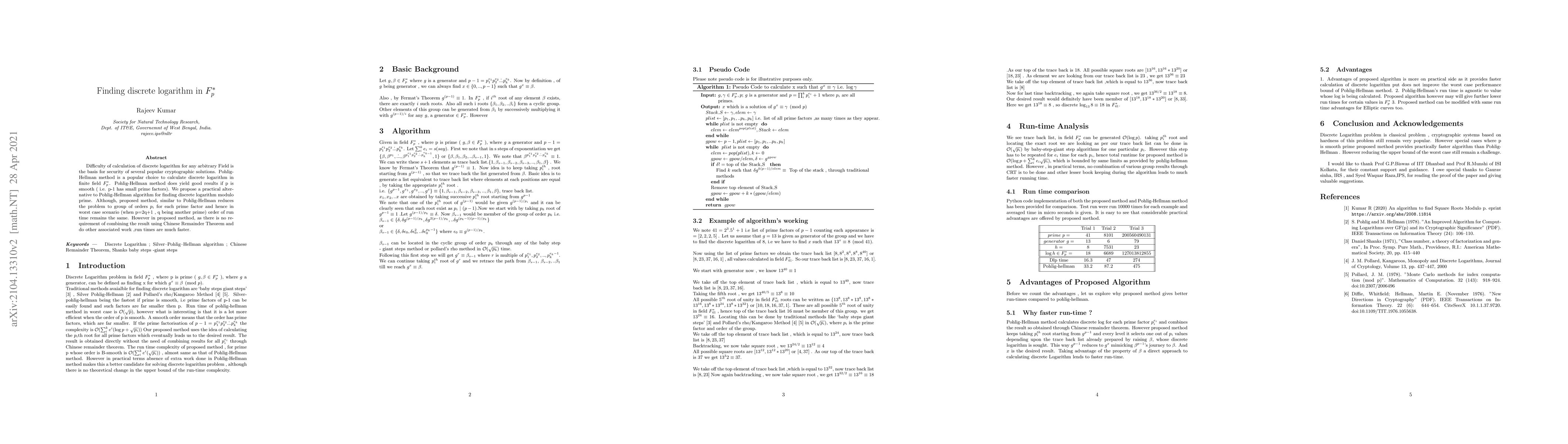 Difficulty of calculation of discrete logarithm for any arbitrary Field is the basis for security of several popular cryptographic solutions. Pohlig-Hellman method is a popular choice to calculate discrete logarithm in finite field $F_p^*$. Pohlig-Hellman method does yield good results if p is smooth ( i.e. p-1 has small prime factors). We propose a practical alternative to Pohlig-Hellman algorithm for finding discrete logarithm modulo prime. Although, proposed method, similar to Pohlig-Hellman reduces the problem to group of orders $p_i$ for each prime factor and hence in worst case scenario (including when p=2q+1 , q being another prime) order of run time remains the same. However in proposed method, as there is no requirement of combining the result using Chinese Remainder Theorem and do the other associated work ,run times are much faster.