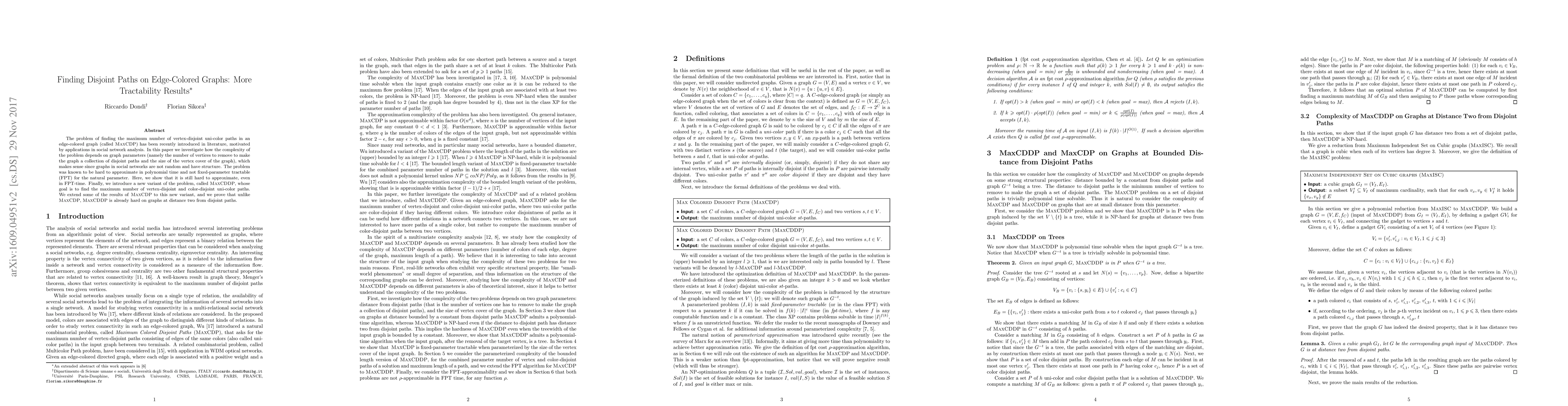 This paper explores the complexity of finding the maximum number of vertex-disjoint uni-color paths in edge-colored graphs, showing that it remains hard to approximate even in fixed-parameter tractable time. It introduces a new variant, MaxCDDP, aiming to find the maximum number of vertex-disjoint and color-disjoint paths, proving it is also hard on graphs close to being disjoint.