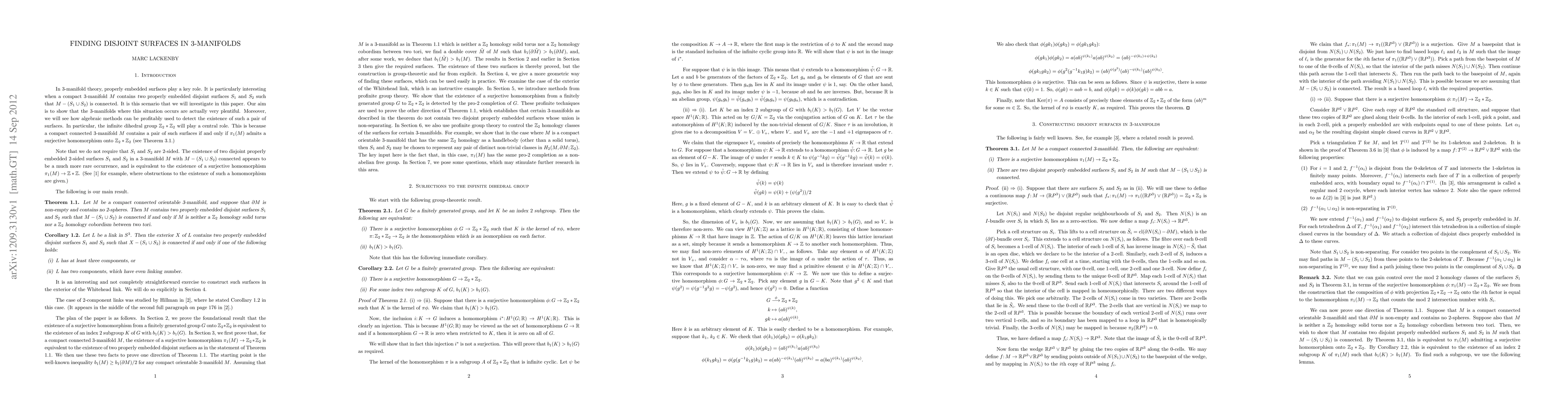 Let M be a compact connected orientable 3-manifold, with non-empty boundary that contains no 2-spheres. We investigate the existence of two properly embedded disjoint surfaces S_1 and S_2 such that M - (S_1 \cup S_2) is connected. We show that there exist two such surfaces if and only if M is neither a Z_2 homology solid torus nor a Z_2 homology cobordism between two tori. In particular, the exterior of a link with at least 3 components always contain two such surfaces. The proof mainly uses techniques from the theory of groups, both discrete and profinite.