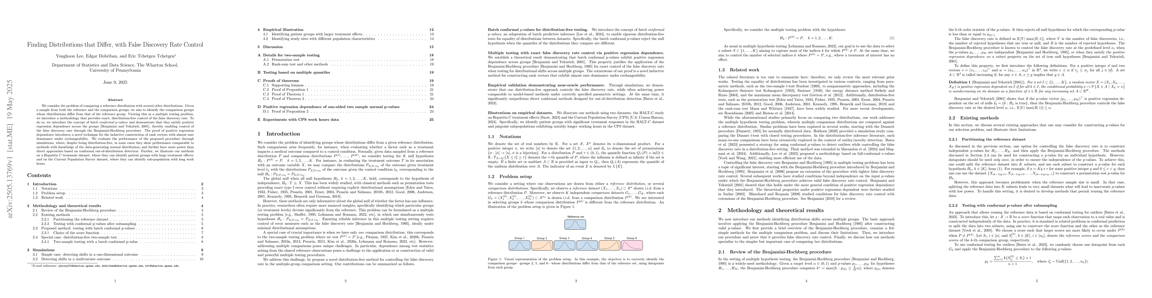 The research introduces batch conformal p-values to identify comparison groups with distributions differing from a reference group, ensuring exact, distribution-free control of the false discovery rate via the Benjamini-Hochberg procedure by proving positive regression dependence across groups.