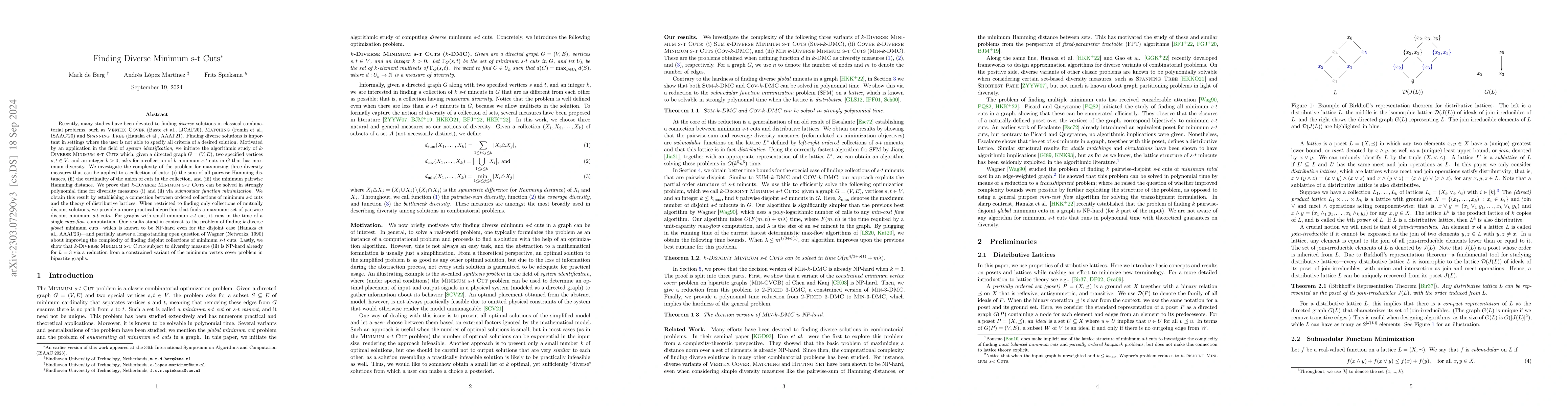 This paper introduces the study of finding diverse minimum s-t cuts in directed graphs, investigating algorithms for maximizing three diversity measures: (i) sum of pairwise Hamming distances, (ii) union cardinality, and (iii) minimum pairwise Hamming distance. The authors present a strongly polynomial time solution for measures (i) and (ii) using submodular function minimization, and a practical algorithm for disjoint cuts running in time of a single max-flow computation. They also prove NP-hardness for measure (iii) even for k=3.