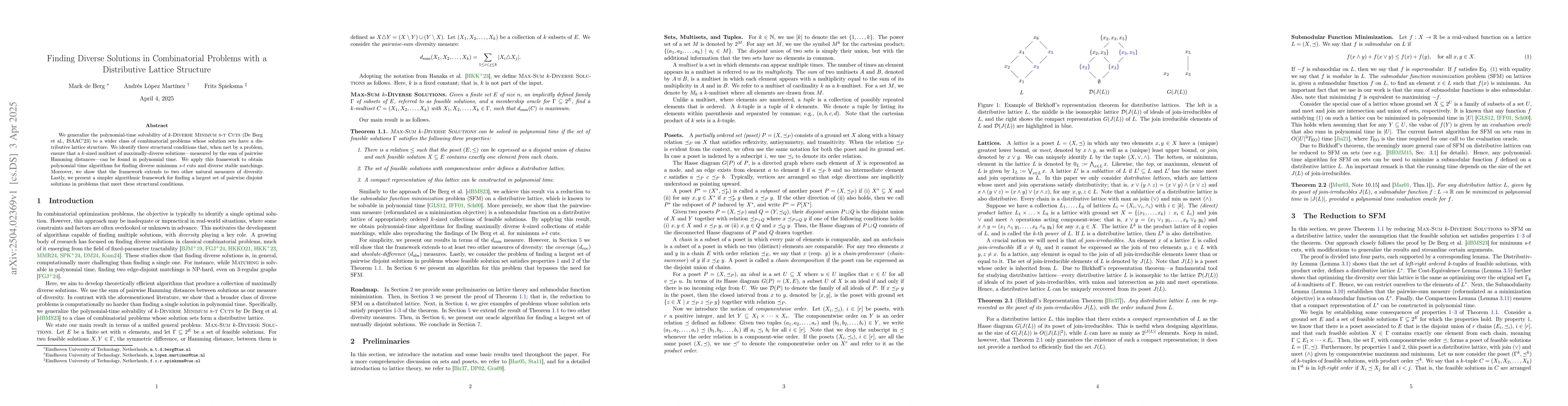 The paper introduces a novel framework for finding diverse solutions in combinatorial problems with distributive lattice structures, along with polynomial-time algorithms for specific problems.