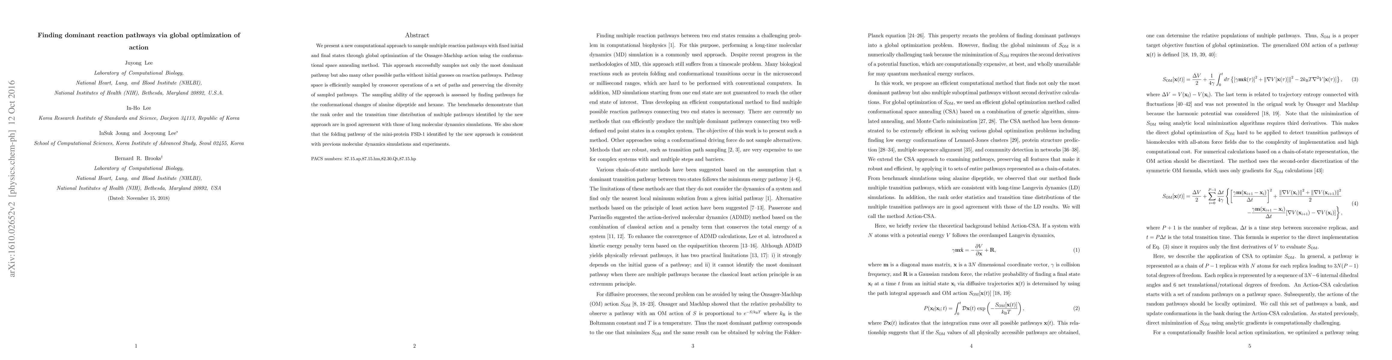 The paper introduces Action-CSA, a computational method for sampling multiple reaction pathways via global optimization of the Onsager-Machlup action, demonstrating its effectiveness in identifying dominant and diverse pathways for conformational changes without initial guesses. Benchmarks on alanine dipeptide, hexane, and mini-protein FSD-1 show good agreement with long molecular dynamics simulations and experimental results.