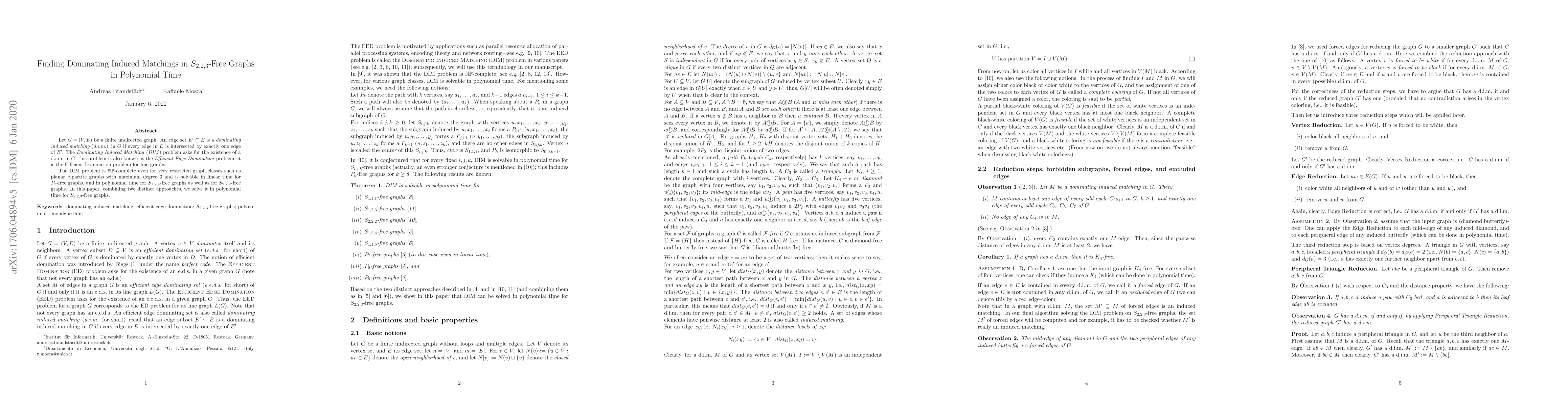 This paper presents a polynomial-time algorithm to determine the existence of a dominating induced matching in $(S_{2,2,3})$-free graphs, addressing the Efficient Edge Domination problem and combining two distinct approaches to achieve this solution. The Efficient Domination problem is \NP-complete for many graph classes, but the authors successfully resolve it for $(S_{2,2,3})$-free graphs.