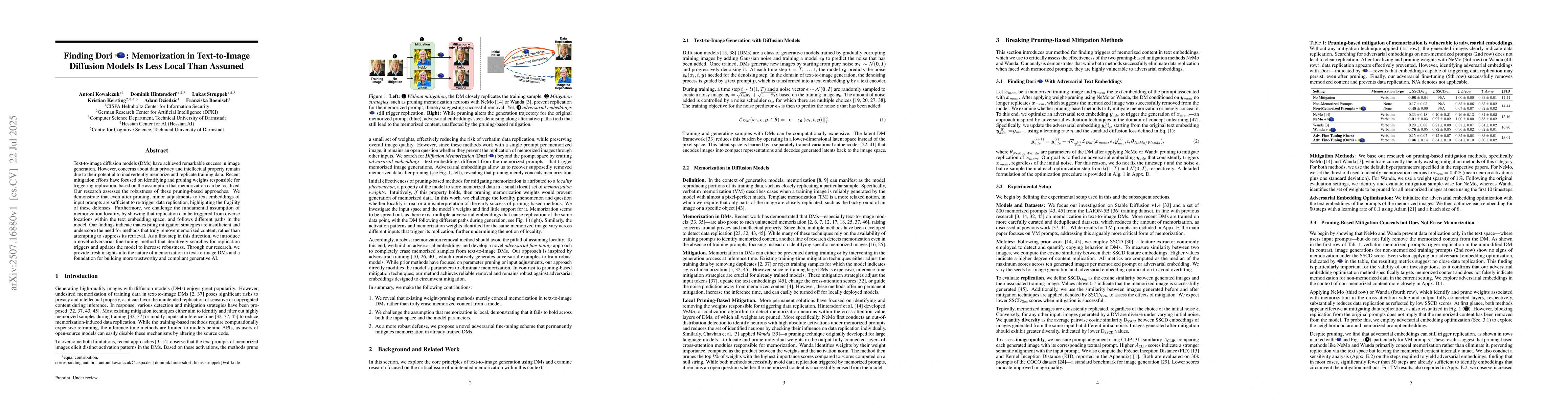 Text-to-image diffusion models (DMs) have achieved remarkable success in image generation. However, concerns about data privacy and intellectual property remain due to their potential to inadvertently memorize and replicate training data. Recent mitigation efforts have focused on identifying and pruning weights responsible for triggering replication, based on the assumption that memorization can be localized. Our research assesses the robustness of these pruning-based approaches. We demonstrate that even after pruning, minor adjustments to text embeddings of input prompts are sufficient to re-trigger data replication, highlighting the fragility of these defenses. Furthermore, we challenge the fundamental assumption of memorization locality, by showing that replication can be triggered from diverse locations within the text embedding space, and follows different paths in the model. Our findings indicate that existing mitigation strategies are insufficient and underscore the need for methods that truly remove memorized content, rather than attempting to suppress its retrieval. As a first step in this direction, we introduce a novel adversarial fine-tuning method that iteratively searches for replication triggers and updates the model to increase robustness. Through our research, we provide fresh insights into the nature of memorization in text-to-image DMs and a foundation for building more trustworthy and compliant generative AI.