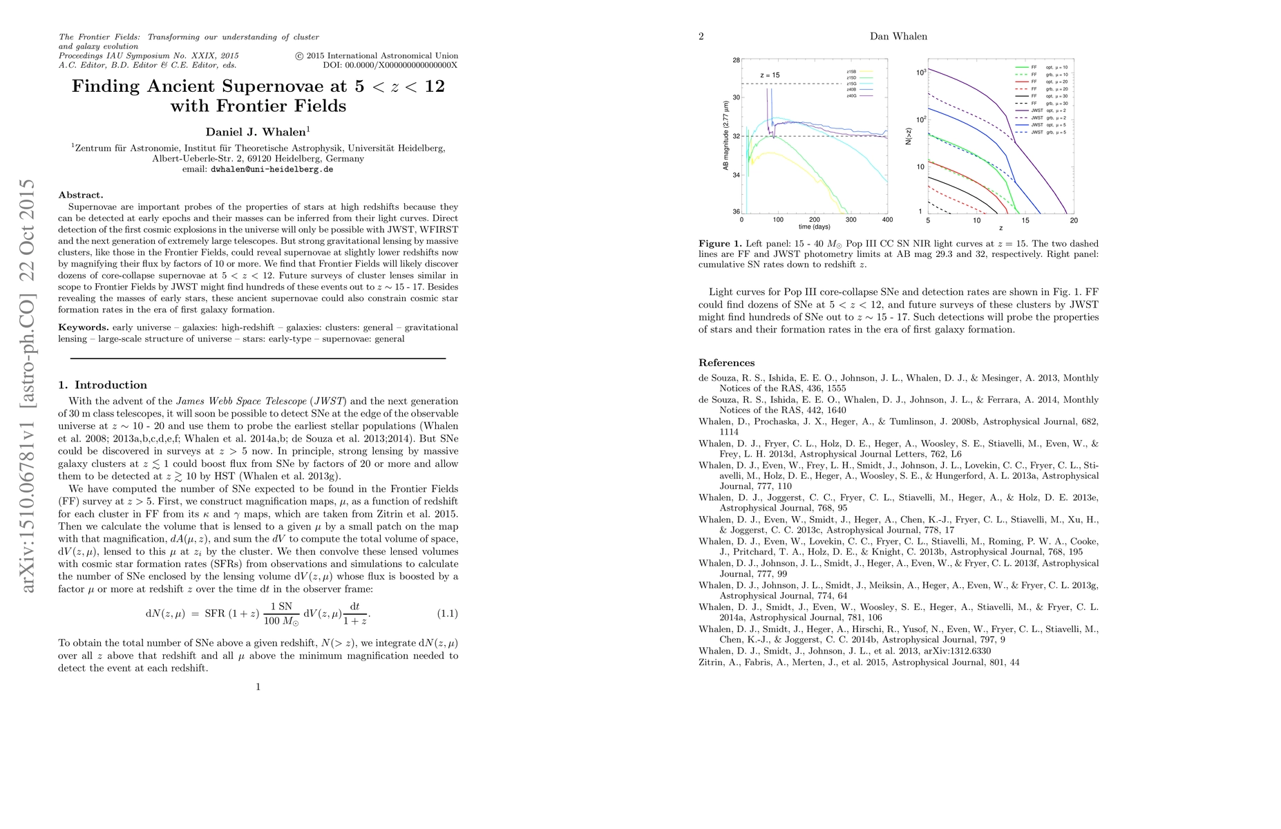 This paper discusses the potential of Frontier Fields to discover core-collapse supernovae at redshifts 5 < z < 12 through strong gravitational lensing, offering insights into early star properties and cosmic star formation rates. Future JWST surveys of similar clusters could extend this discovery to redshifts up to 17.