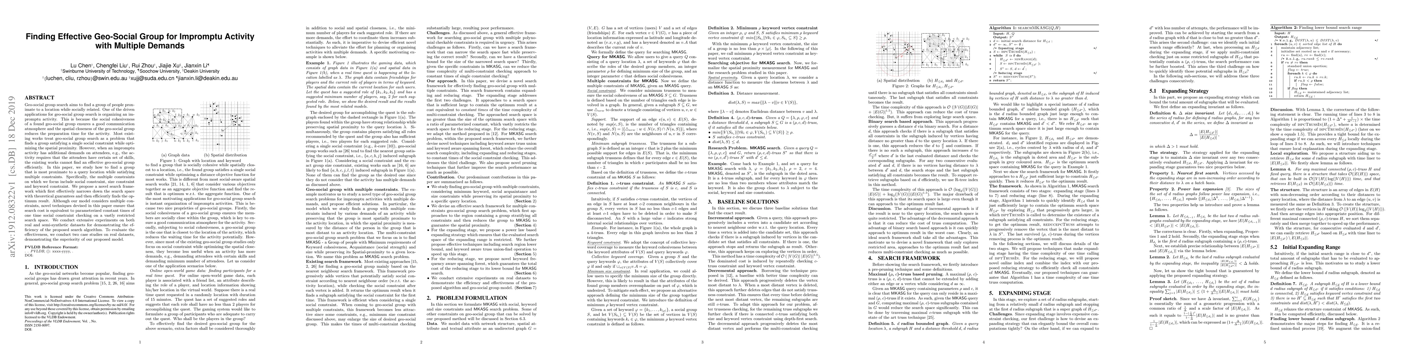 This paper proposes a novel framework for finding geo-social groups that satisfy multiple constraints for organizing impromptu activities, including social, size, and keyword constraints. The proposed method efficiently narrows the search space and ensures low search cost, demonstrated through experiments and case studies on real datasets.