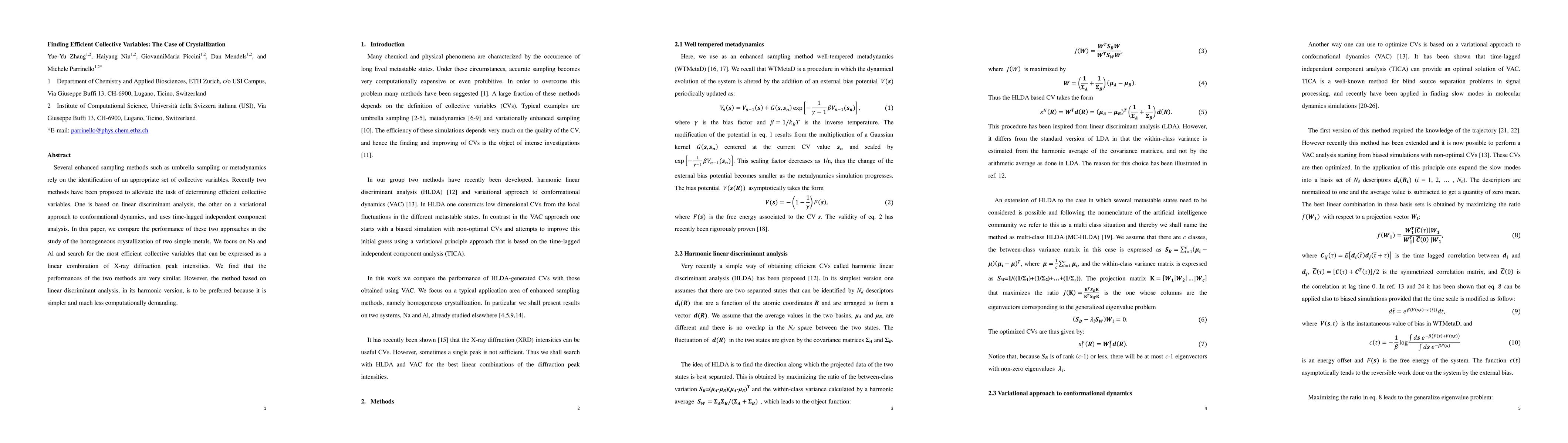 This paper compares two methods for identifying efficient collective variables in crystallization studies: one based on linear discriminant analysis and the other using a variational approach with time-lagged independent component analysis. Both methods are tested on the crystallization of Na and Al, finding similar performance but favoring the simpler and less computationally intensive linear discriminant analysis method.