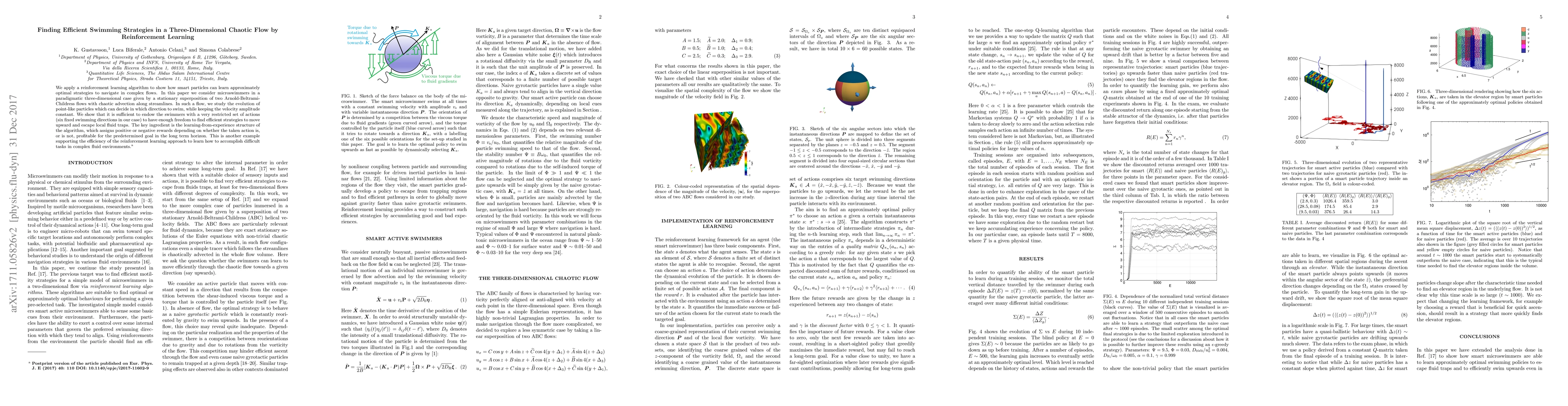 This paper uses reinforcement learning to demonstrate how microswimmers can develop optimal navigation strategies in a chaotic three-dimensional fluid flow. The study shows that even with limited actions, the swimmers can learn to efficiently move upward and avoid traps, highlighting the effectiveness of reinforcement learning in complex environments.