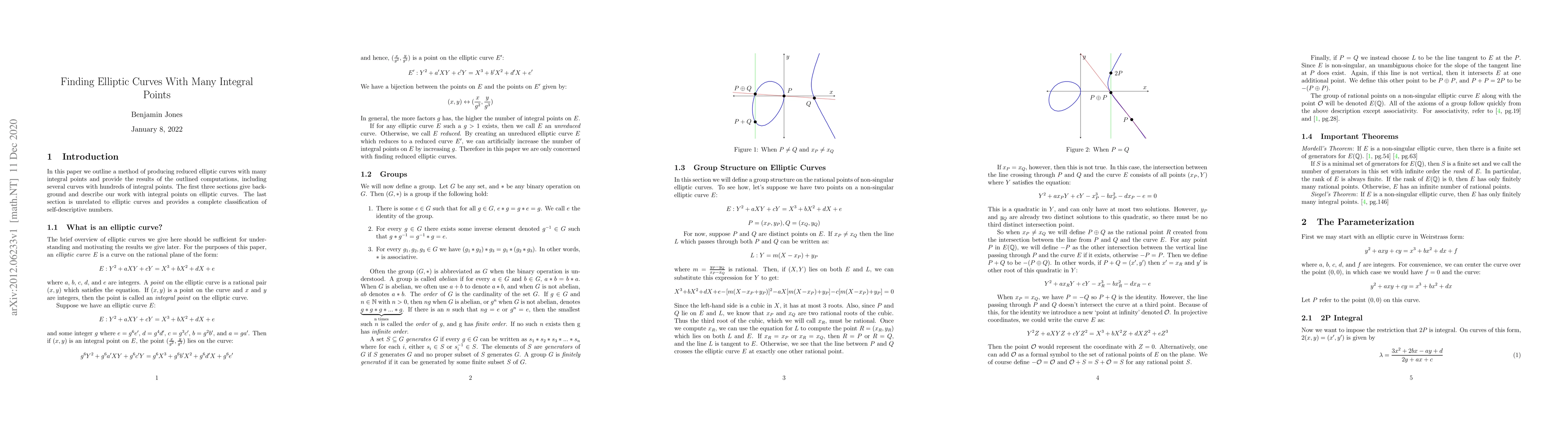 This paper develops parameterizations for elliptic curves over rationals with many integral points and high multiples of a point, and uses computational tools to identify specific curves meeting these criteria, also classifying "self-descriptive numbers" based on zero counts.